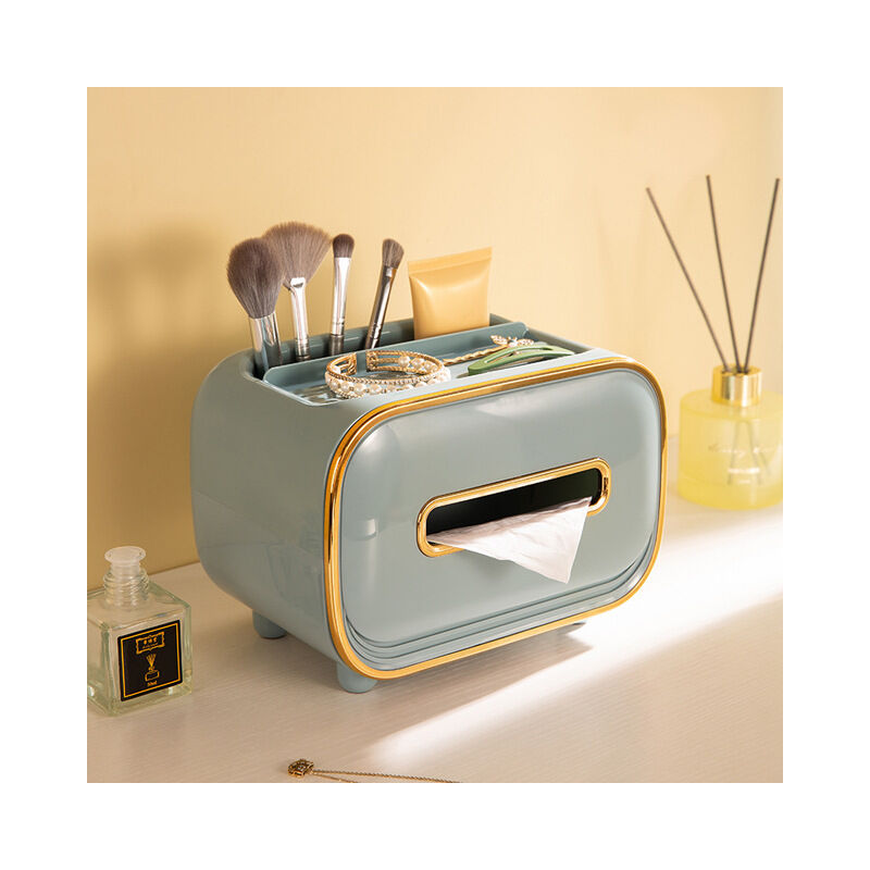 PRODUCTINFORMATIONNome del prodotto: scatola di fazzoletti multifunzionale per animali domesticiDimensioni: 21*14*15cmMateriale: PET (corpo principale) ABS (placcatura a strisce decorative) silicone (pad antiscivolo)Colore: azzurro/verde erba/bianco eleganteCaratteristiche: archiviazione a doppio strato, supporto per cellulare, design a bocca larga,Carta robusta e resistente, facile da cambiare, interruttore magnetico