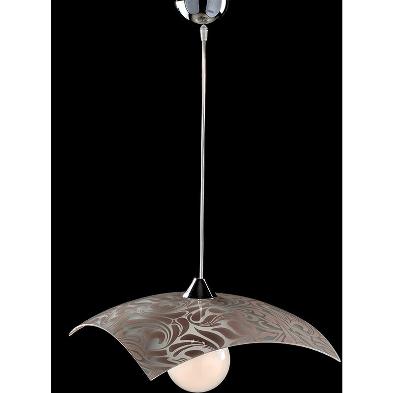 Collezione Marmo DESIGN SEMPLICE E DI TENDENZA IN VETRO SERIGRAFATO Sospensione a 1 luce con dettagli in metallo cromato e ampio diffusore in vetro 40x40 serigrafato con leggiadri ghirigori tonalità tortora con apertura a fazzoletto. Altezza regolabile e disponibile anche di diametro superiore. Un disegno gradevole ed suadente per ambienti moderni.