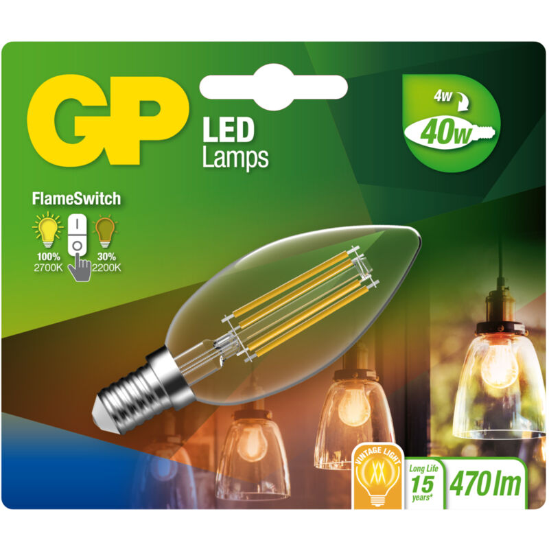 Candela GP LED Fila. Fs 4w E14Versione: GP LED Candle FilamentFlameSwitch = 2 impostazioni di luce in una lampada: cambia l'atmosfera con l'interruttore a parete esistenteL'intelligenza è nella lampada stessa, quindi non è necessario alcun dimmerIl chip di memoria integrato ricorda l'ultima impostazione di luce sceltaAdattamento: E14Forma della lampada: CandelaPotenza: 40 WattConsumo energetico: 4 WattIntensità luminosa: 470 LumenEffetto luminoso: TrasparenteClasse di efficienza energetica: A++Voltaggio: 220 - 240 VoltTemperatura colore: da 2200K a 2700KLunghezza: 9,7 cmDiametro: 35 mmTempo di combustione: 15.000 oreDurata: 15 anniDimmerabile: FlameSwitchContenuto della confezione: 1
