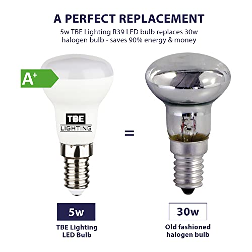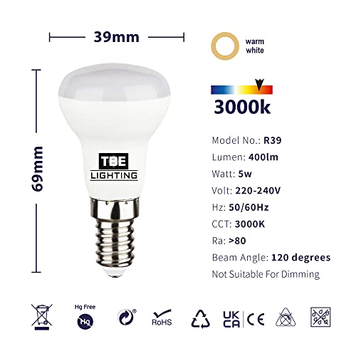 TBE Lighting - Lampadina a LED R39 da 5 W, attacco a vite piccolo E14, equivalente a 30 W, lampadina R39 a risparmio energetico, 400 lumen, 20.000 ore di durata (3000 K, luce bianca calda)