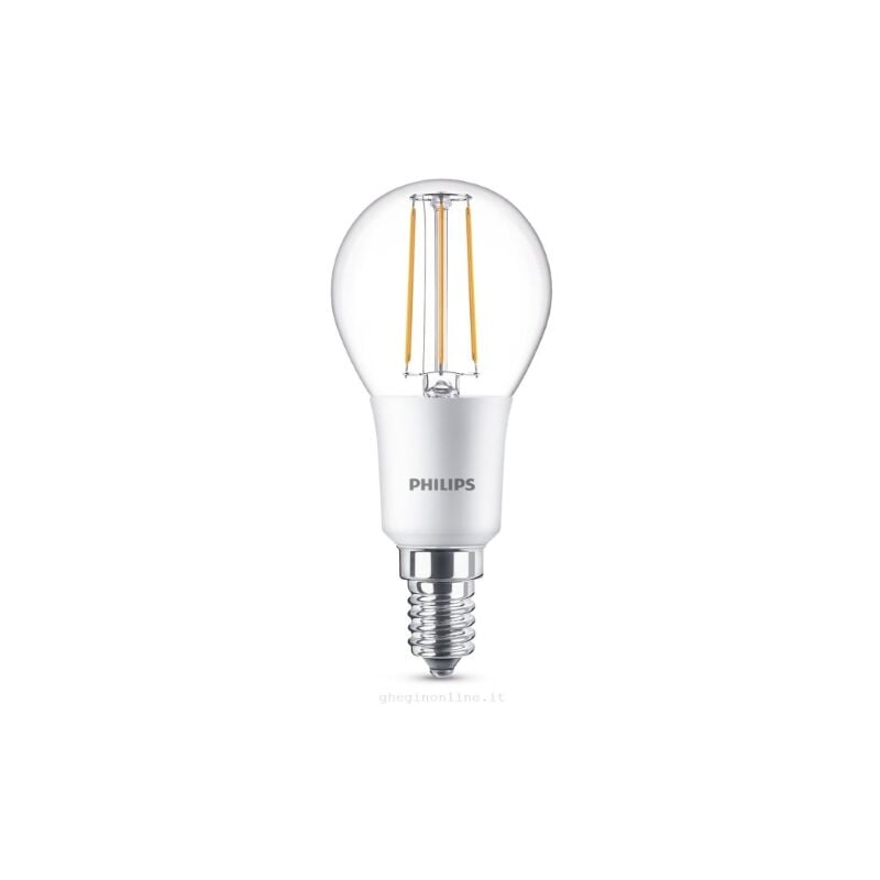 Le lampadine LED Philips Classic riproducono i filamenti incandescenti per offrirti il bagliore vintage delle lampadine tradizionali riducendo le spese in bolletta Fatte per essere ammirate, belle da vedere sia accese che spente Dimmerabile con l'interruttore dimmer che hai in casa Potenza 4.5 W equivalenti a 40 W Attacco E14, forma sfera