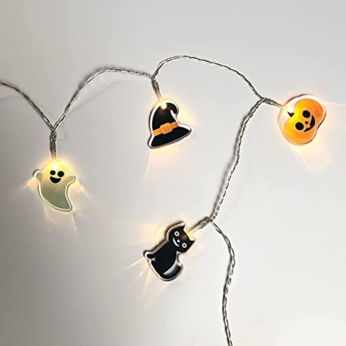 12 LED bianchi caldi con effetto statico sono inclusi lungo questa catena luminosa di Halloween con figure di gatto, cappello di strega, fantasmi e zucche
