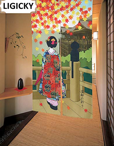 LIGICKY - Tenda giapponese Noren, per porta Kyoto, Geisha, ragazze e foglie di acero giapponesi, stampata, lunga 85 x 150 cm