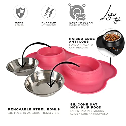 Ligo - Ciotole per Cani e Gatti di Piccola, Media e Grande Taglia, Ciotola Doppia in Acciaio Inossidabile Antiscivolo e Anti Goccia, Ciotola Cane con Tappetino in Silicone (M, ROSA)