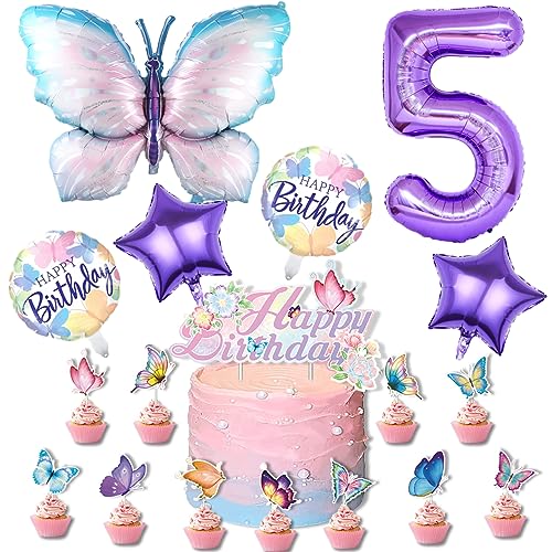 Liitata 5. Farfalla decorazione di compleanno con farfalla, set di palloncini viola con numero 5, palloncini in pellicola, grande farfalla colorata, palloncini Happy Birthday Butterfly per ragazze