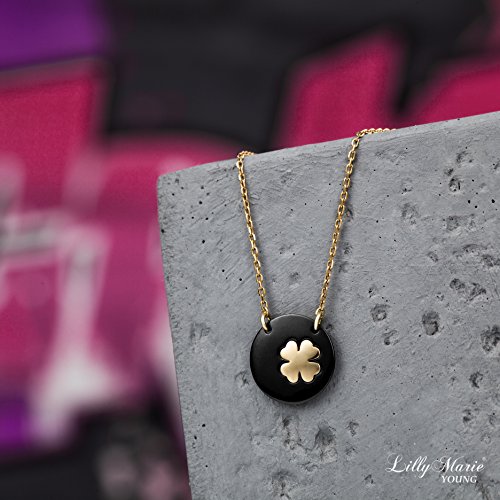 LillyMarie Donne Catena argento placcato oro Argento sterling 925 Ciondolo Quadrifoglio Portafortuna nero lunghezza regolabile Sacchetto stoffa Regali per la mamma