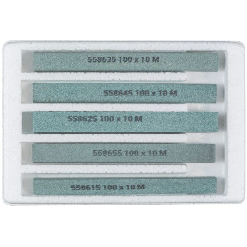 Composto dalle lime abrasive più comuni, dalla rettifica di sgrossatura a quella di precisione. Uso: Per sbavare, affilare, levigare e smussare utensili o taglienti di utensili. Per la lavorazione di fori, superfici e bordi nella realizzazione di stampi. Anche per migliorare e levigare la superficie. Fornitura: cad. 1 lima abrasiva 100×10M triangolare, quadra, tonda, mezzotonda, piatta. Nota: Utilizzare preferibilmente con olio, petrolio o acqua. Dati tecnici Sigla materiale abrasivo SiC Materiale abrasivo Carburo di silicio (SiC) Tipo di prodotto Lima abrasiva Numero di lime abrasive 5 Ti m/s idoneo Acciaio < 55 HRC m/s idoneo a umido max. idoneo Alluminio, CFRP m/s idoneo Metallo duro (HM) m/s idoneo Acciaio < 60 HRC m/s idoneo GG(G) m/s idoneo Acciaio < 67 HRC m/s idoneo a secco limitatamente adatto INOX m/s idoneo CuZn m/s idoneo Pietra m/s limitatamente adatto