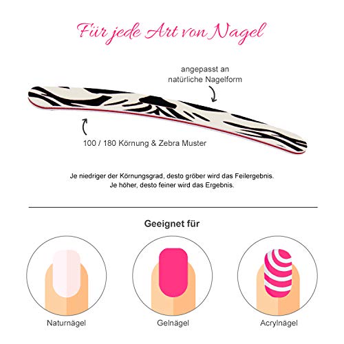 Funzionalità nel set: 10 pezzi - Le lime a forma di banana con un nucleo rosa sono ideali per numerosi design delle unghie. Il nucleo della lima garantisce una guida stabile e consente così un lavoro preciso e preciso sulle unghie