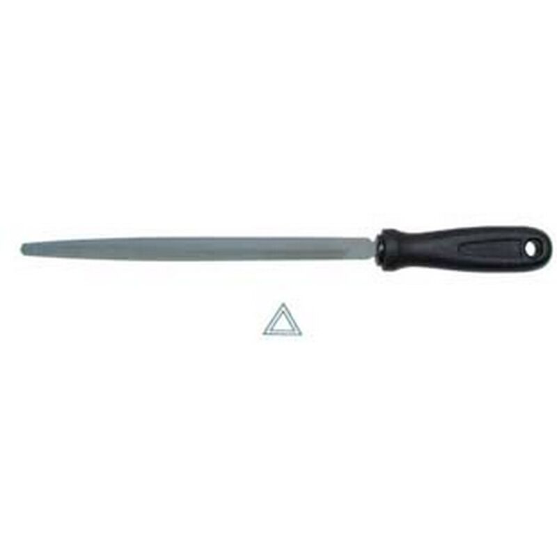 In acciaio, bordi vivi e intagliati per limare le gole tra i denti della sega, leggermente rastremate verso la punta