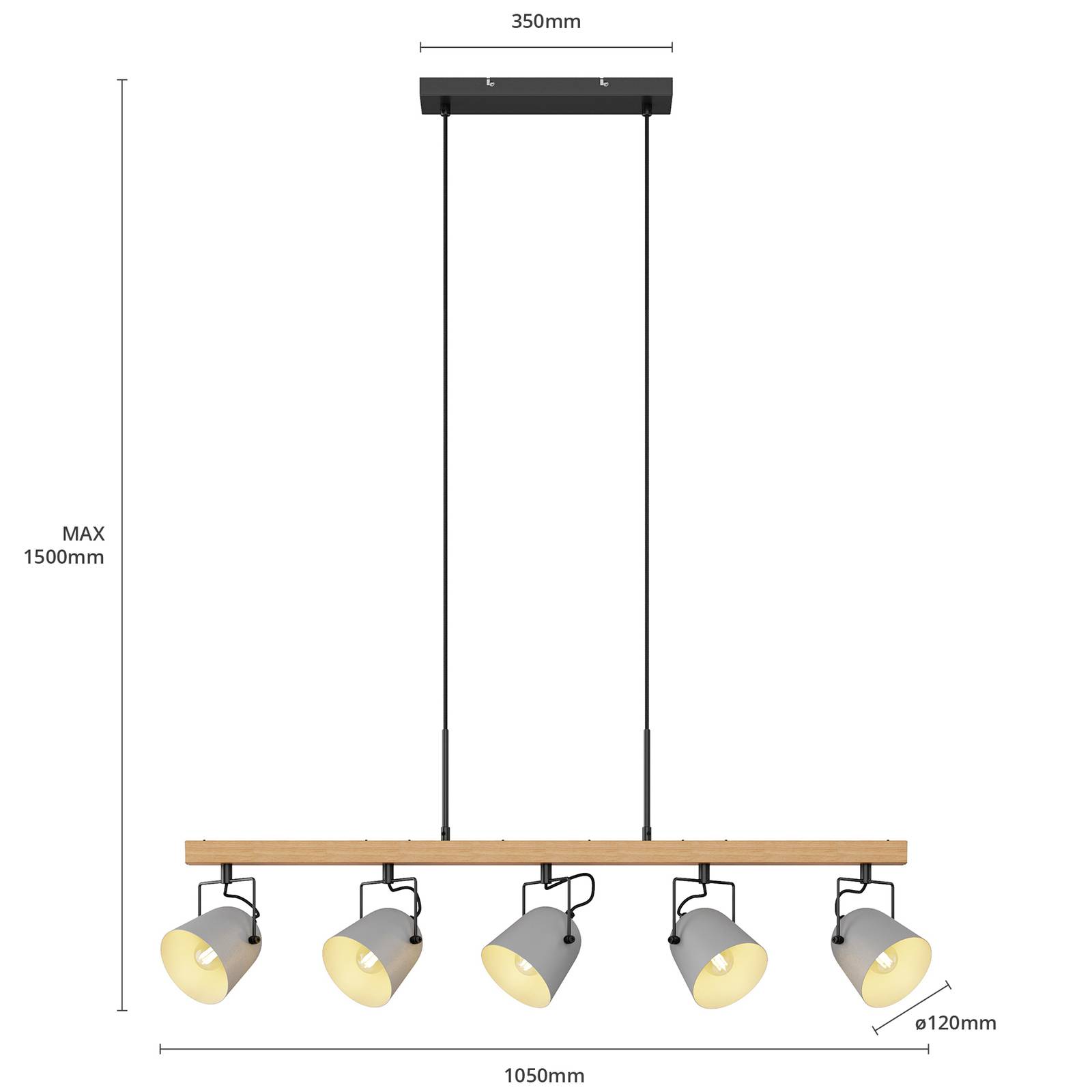 Lampada a sospensione allungata Adalin in rovere chiaro e acciaio grigio La lampada a sospensione Adalin trova il suo posto perfetto sopra un tavolo da pranzo. Un montante di legno allungato pende da due sospensioni su un discreto supporto a soffitto e porta cinque paralumi. Il legno chiaro e il grigio tenue creano un contrasto di colore attraente, che completa benevolmente il design della lampada. I paralumi possono essere equipaggiati con lampadine E14 e il loro numero abbondante permette un'illuminazione intensa. La lampada a sospensione Adalin diffonde un sottile fascino da casa di campagna e crea un'atmosfera accogliente all'interno dell'ambiente.