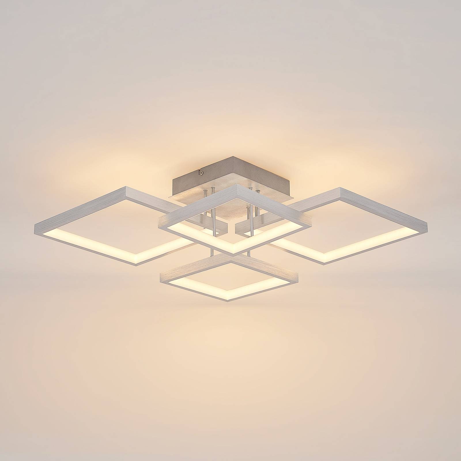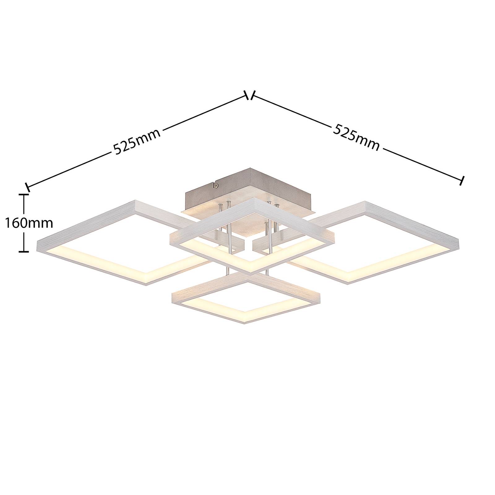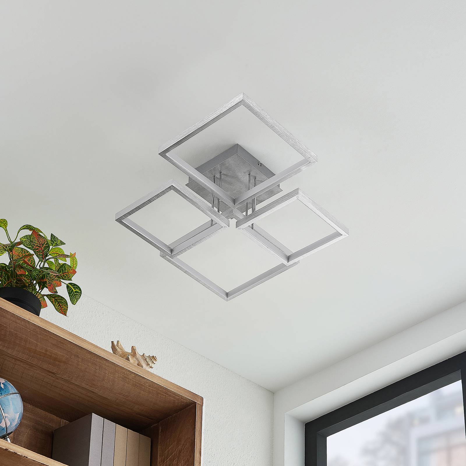 Plafoniera a LED geometrica Adritha nel design chic La plafoniera a LED Adritha è un oggetto decorativo emozionante e una luce affidabile con funzioni pratiche. È realizzato in acciaio e alluminio e attira molto l'attenzione per la sua sorprendente forma geometrica. I suoi LED installati in modo permanente scorrono all'interno di quattro cornici luminose quadrate, che vengono montate sfalsate su una staffa a soffitto e creano un interessante schema. Tramite un interruttore a muro è possibile accendere e spegnere la luce come di consueto. Grazie alla tecnologia di dimmerazione a 3 fasi con funzione off integrata, può anche essere dimmerata a tre diversi livelli di luminosità premendo più volte l'interruttore: 100 %, 40 % e 10 %. L'apparecchio da soffitto a LED Adritha fornisce quindi sempre la giusta illuminazione e, con il suo aspetto entusiasmante, pone accenti sorprendenti sui soffitti degli appartamenti, rendendo ogni stanza qualcosa di molto speciale.