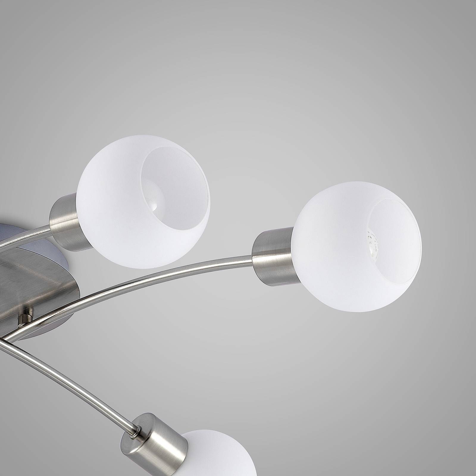 Plafoniera a LED Agmar in nichel per un'illuminazione ideale La plafoniera a LED Agmar ispira con il suo design moderno e dinamico. È costituito da tre bracci di lampada, alle estremità di ognuno dei quali è un paralume. Le braccia si estendono molto all'interno della stanza, in modo che tutti gli angoli della stanza siano illuminati da una calda luce bianca. I paralumi sono in vetro e hanno una finitura satinata. In questo modo la luce si diffonde dolcemente e uniformemente nella stanza. Questo crea un'atmosfera piacevole e accogliente.