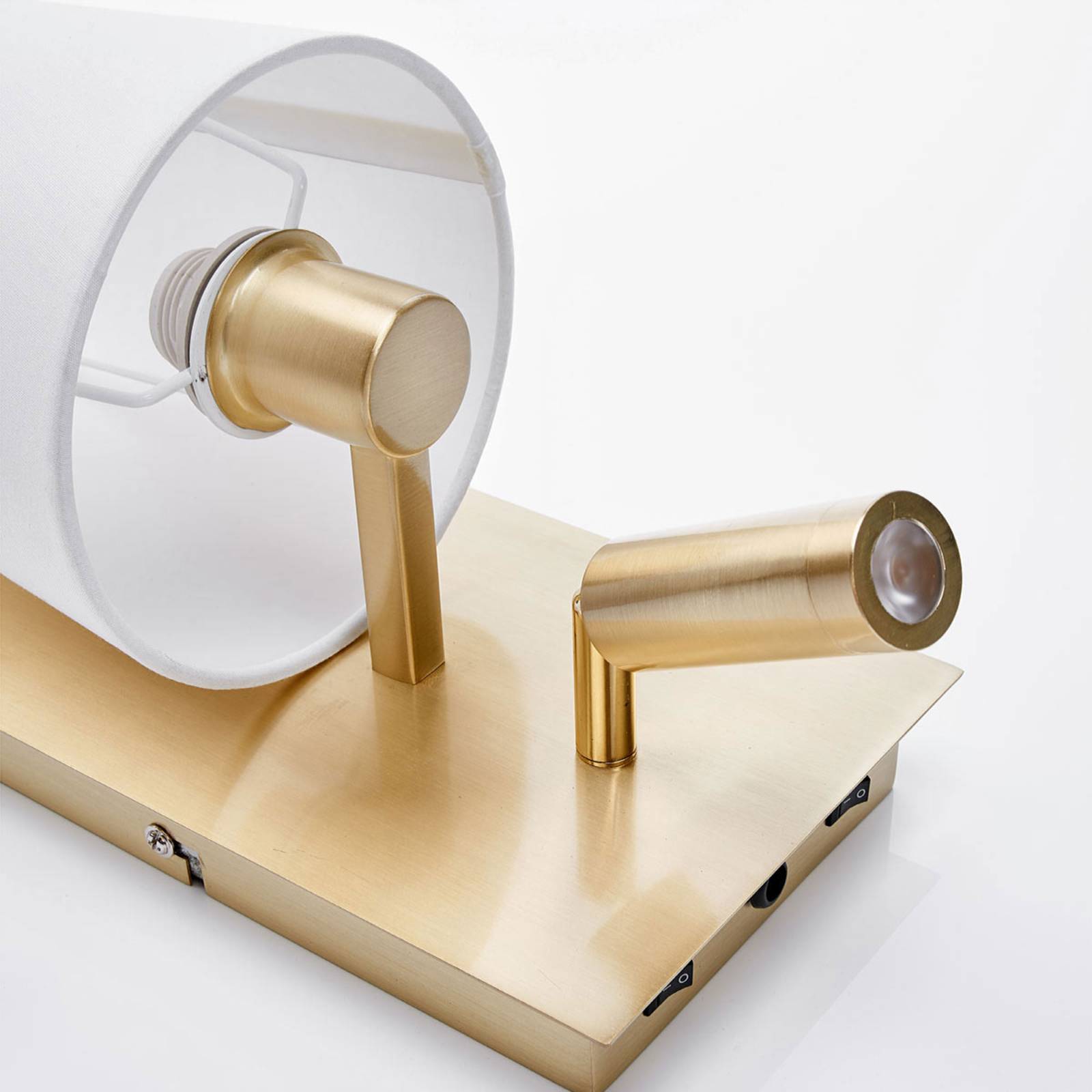 Lampada da parete Aiden color ottone con luce di lettura cilindrica a LED e paralume in tessuto biancoQuesta lampada da parete in tessuto si adatta bene alla camera da letto accanto al letto e offre i vantaggi di due diverse fonti di luce. Il paralume in tessuto bianco crea una luce accogliente, uniforme e non abbagliante per il relax, mentre la luce di lettura cilindrica è dotata di un LED e crea una luce puntuale con una buona luminosità, fornendo un sollievo ottimale per gli occhi durante la lettura. La lampada da parete può essere collocata bene anche in salotto, dietro il divano, e beneficia del fatto che ha due interruttori azionati separatamente, in modo da poter scegliere se accendere entrambe le lampade o solo una di esse. La superficie della struttura metallica è in tonalità ottone opaco e valorizza l'aspetto classico della lampada da parete, che può essere utilizzata anche in ambito commerciale nel settore alberghiero. Luce di lettura:- bianco caldo (3.000 K)- 210 lumen