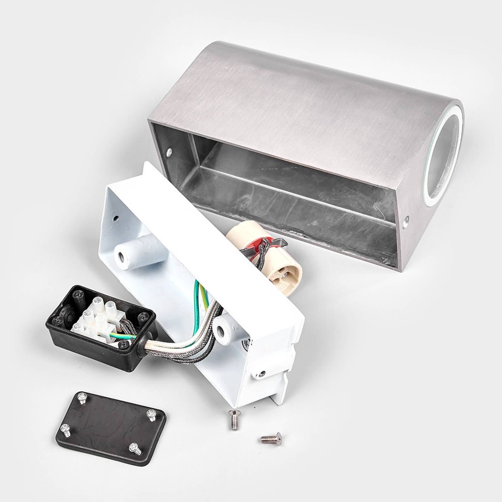 Idris - applique da esterni in alluminio con emissione bilaterale L'applique da esterni Idris in alluminio è una fonte di luce decisamente elegante all'esterno. Si monta su ogni tipo di muri e facciate e si intona molto bene alle case moderne. Nella variante ad emissione bilaterale i portalampada GU10 si trovano sia in alto che in basso.
