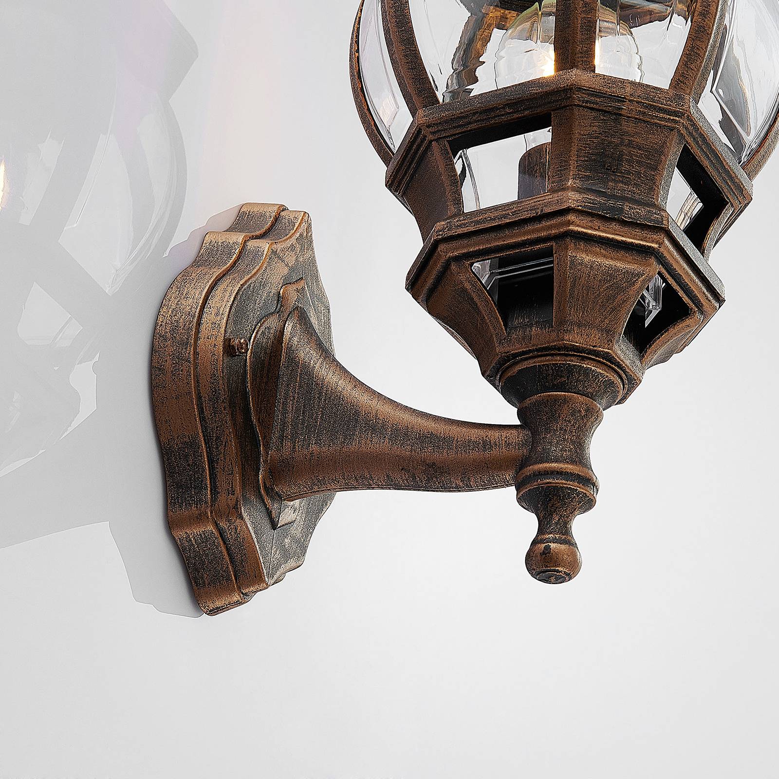 Applique da esterni dorata Nadesha - fascino antico e orientaleggiante Nadesha è una splendida lampada da esterni che convince in pieno con la sua luccicante finitura dorata che sembra antica. Questa lavorazione suggerisce anche un fascino orientaleggiante. La lampada è costruita interamente in materiale plastico, compresi i vetri trasparenti. Di conseguenza Nadesha resiste bene alla corrosione. Come sorgenti luminose si consigliano lampadine LED rustiche o a filamento che hanno un'estetica molto somigliante a quella delle lampadine tradizionali. - Grado di resistenza agli urti IK06