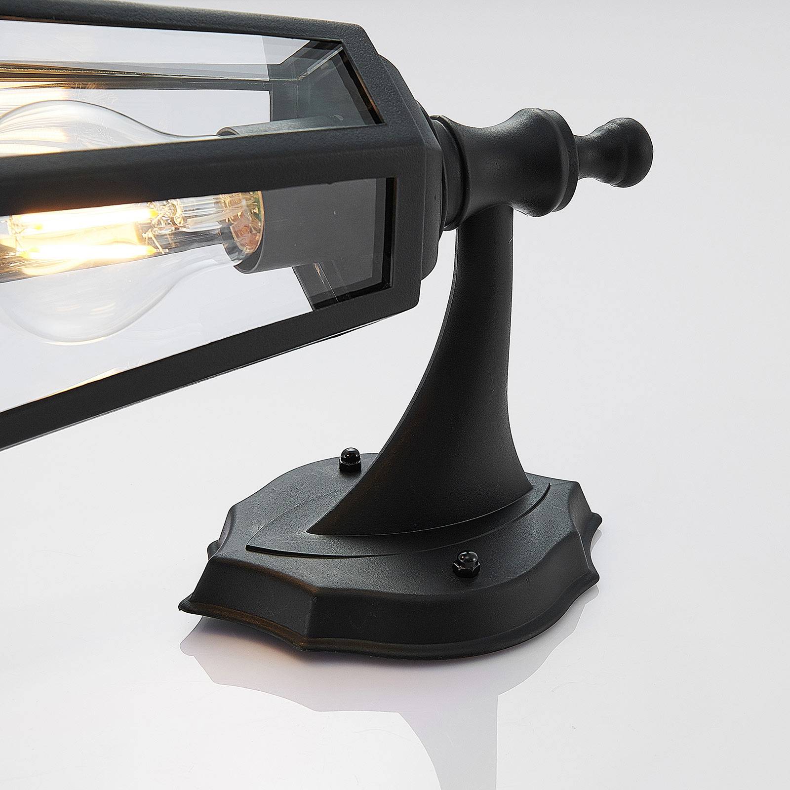 Applique da esterni Nane a nostalgica forma di lanterna nera, anticorrosione L'applique da esterni Nane ha un portalampada E27 e vetri trasparenti che lasciano vedere bene la lampadina all'interno. Per questo si consigliano lampadine LED a filamento che hanno un'estetica molto somigliante a quella delle lampadine tradizionali. La costruzione è anticorrosione. Questo significa che la si può montare in zone costiere senza che subisca danni. La lampada esprime tutto il fascino nostalgico tipico di una lanterna. La struttura di materiale plastico è in colore nero.