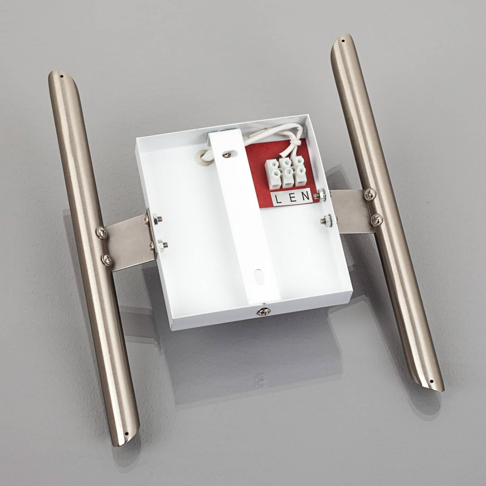 Applique squadrata Filippa in vetro e metallo Questa applique colpisce grazie all'aspetto molto accattivante, il diffusore in vetro leggermente arcuato è integrato lateralmente da due elementi in metallo con una superficie opaca in nickel. Installata sul muro, Filippa dà un impressione molto elegante e naturalmente moderna. L'inserto in vetro satinato permette una distribuzione delicata e calda della luce, e la scelta delle lampadine è quasi illimitata, in quanto il portalampada E27 consente di utilizzare sia lampadine a incandescenza o alogene, sia le più efficienti lampadine a risparmio energetico e a LED.