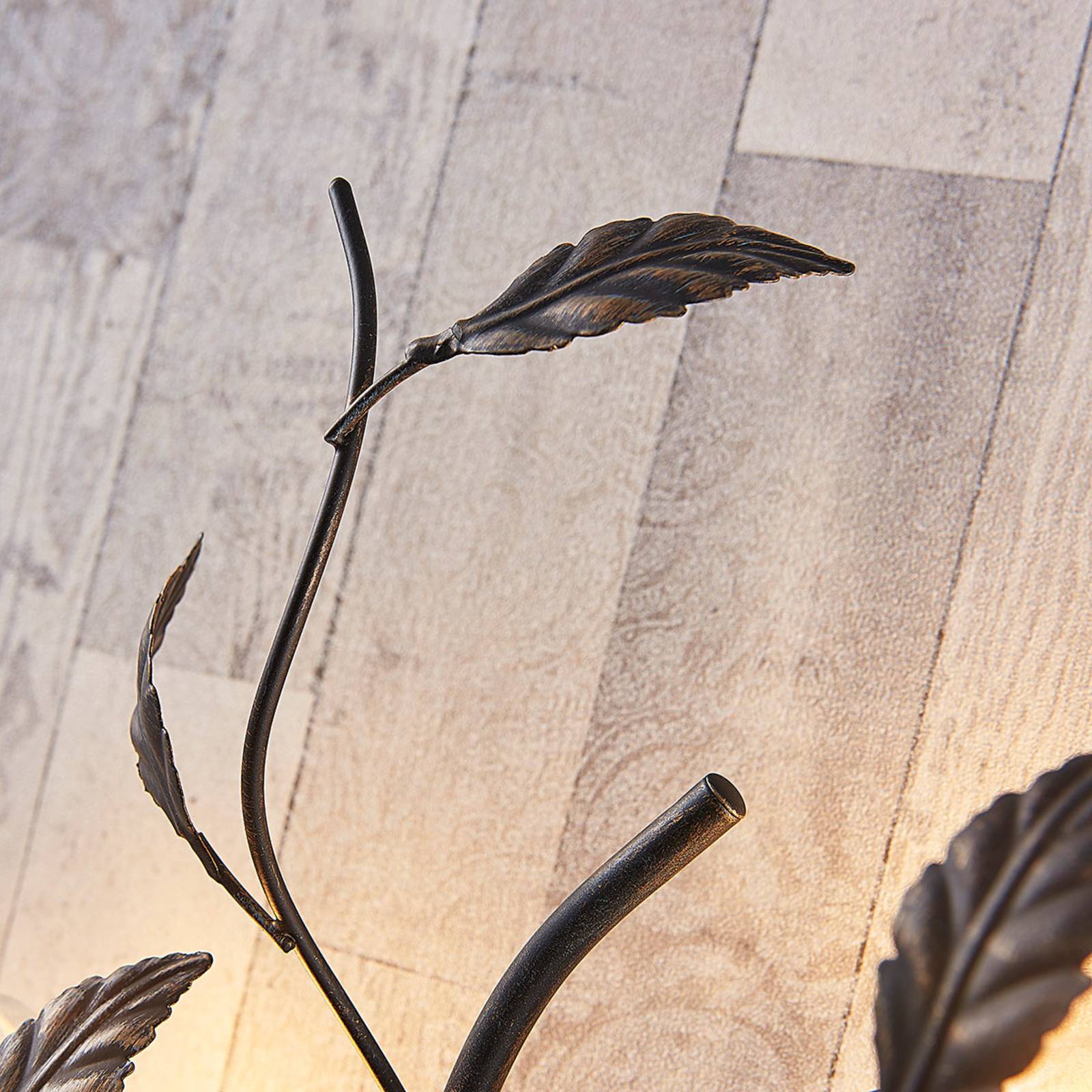 Applique Yos dall'aspetto elegante con decorazione a foglie in metallo Questa applique è l'aggiunta perfetta agli stili di vita classici che vogliono apparire un po' romantici o giocosi. La lampada è costituita da una struttura in metallo rivestita di foglie come i rami di un albero o di un arbusto. Lo sfondo delle foglie è nero e su di esse sono presenti sottili pennellate dorate, che creano un certo aspetto antico. Yos è illuminata da due lampade E14, che possono essere selezionate a piacere, e la luce appare accogliente e artistica.