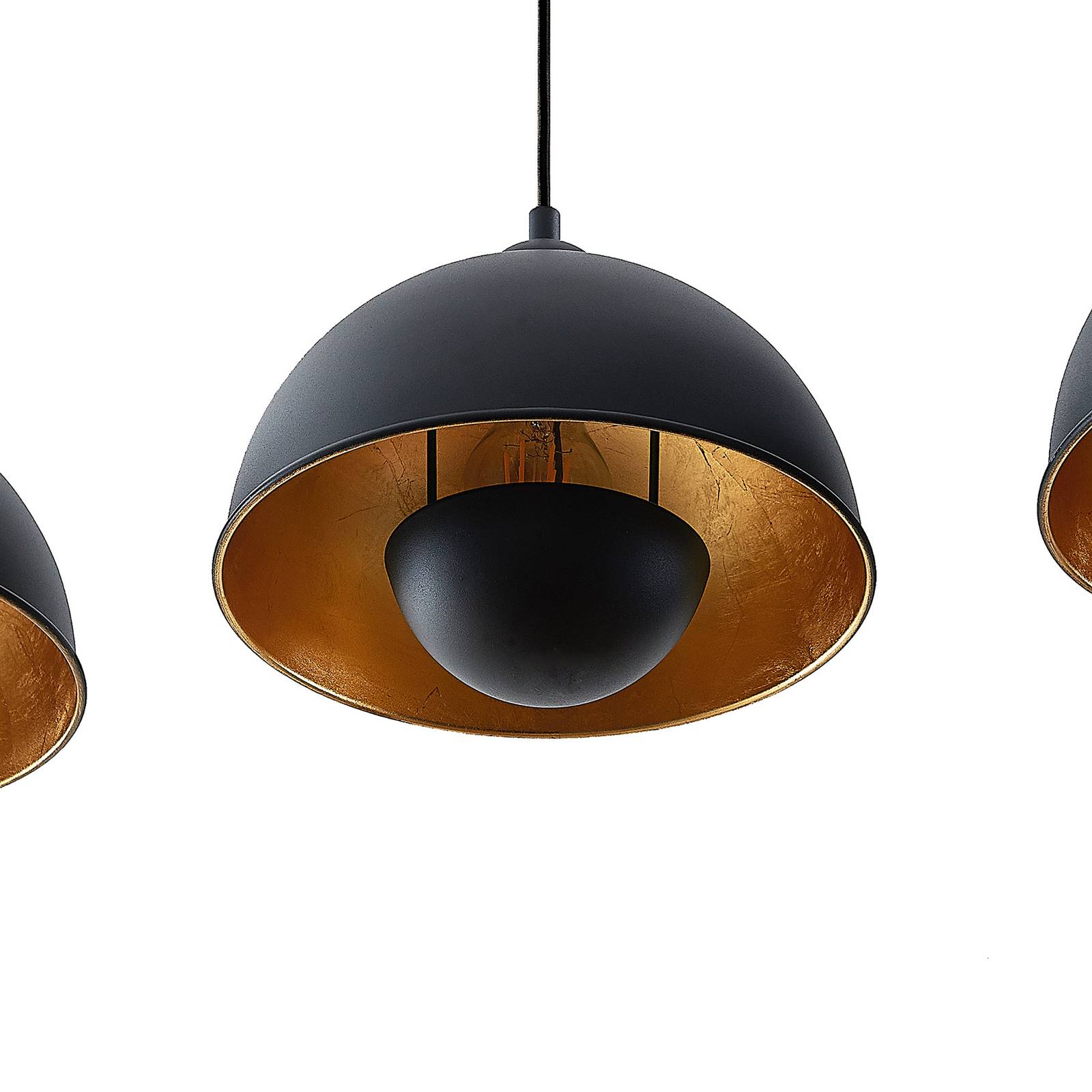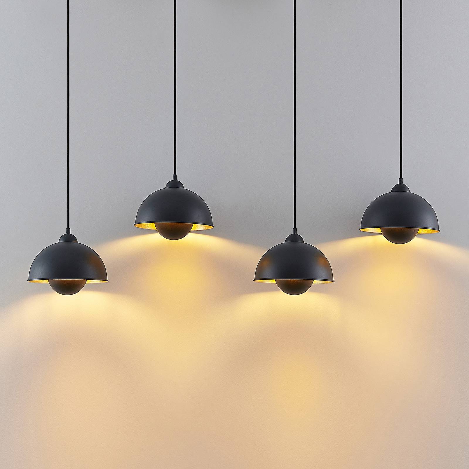 Lampada a sospensione Bamila con quattro tonalità di metallo su un elemento di legno zoppo La lampada a sospensione a quattro luci Bamila è ideale per illuminare il tavolo da pranzo o il bancone in cucina o nella sala da pranzo e si adatta allo stile moderno della casa di campagna così come alla zona del giovane soggiorno. I paralumi neri opachi a forma di semisfera sono stati progettati con una lamina dorata all'interno, in modo che la luce delle lampadine (non incluse) ottenga un caldo luccichio. Le tonalità sono appese a cavi rivestiti di tessuto dal lungo elemento in legno e possono essere sospese in modo variabile avvolgendo il cavo intorno al legno come desiderato.