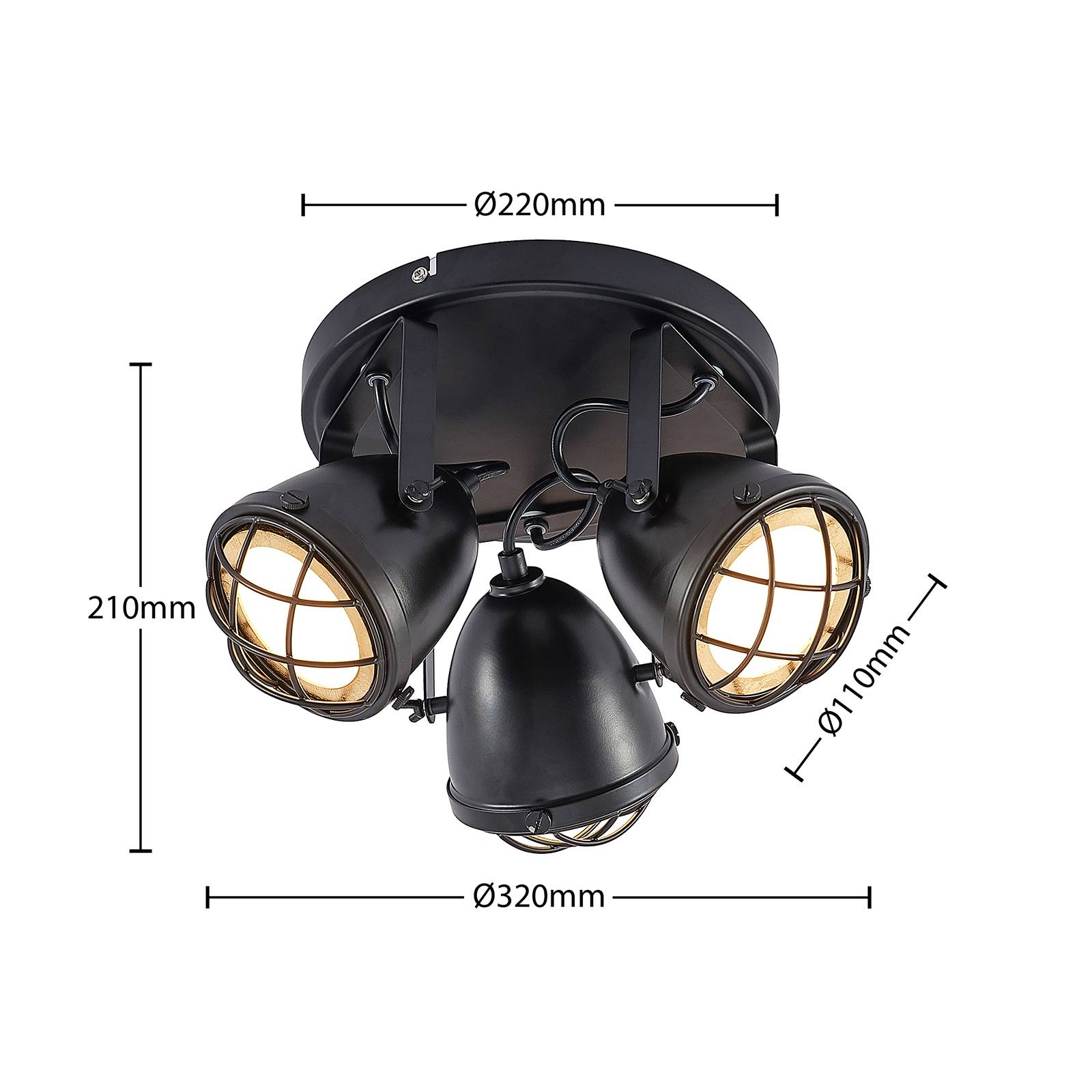 Faretto da soffitto Biona con anello dorato discreto sulla sorgente luminosa Tre paralumi sono fissati al fissaggio rotondo per soffitto della plafoniera Biona. Questi possono essere orientati in modo da dirigere la luce in modo individuale. I paralumi della plafoniera sono realizzati in metallo nero opaco e la sorgente luminosa interna è dotata di un discreto anello color oro che impreziosisce il design con eleganza. I paralumi sono inoltre dotati di una griglia che conferisce al lampadario un aspetto vintage di tendenza e un fascino industriale. La griglia decorativa protegge anche la grande sorgente luminosa a LED all'interno. La sorgente luminosa emette una luce bianca calda che non abbaglia grazie alla superficie satinata.
