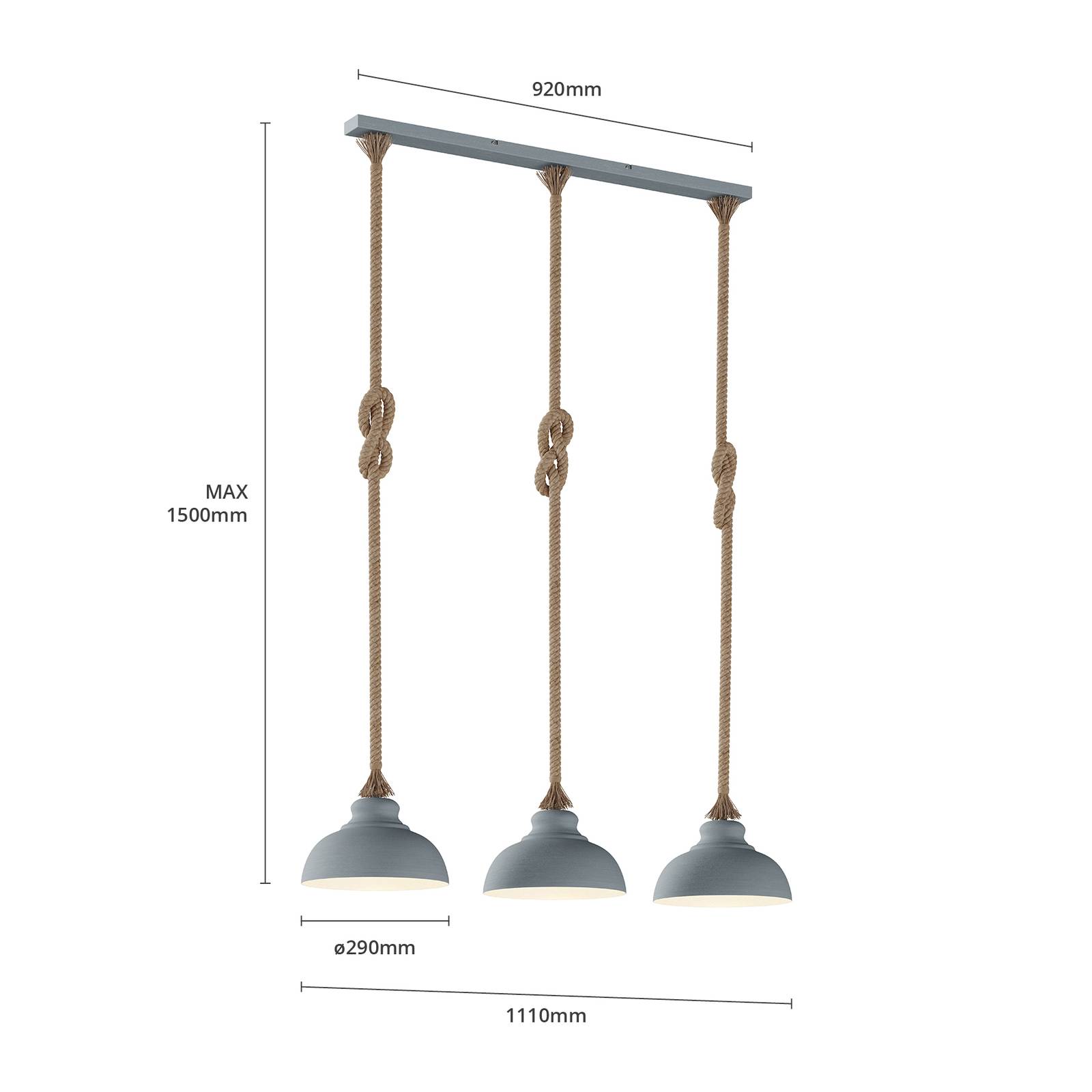 Lampada a sospensione a 3 luci Chaby con fune legata a nodi e finto cemento Nella lampada a sospensione a 3 luci Chaby il cavo si nasconde dietro una spessa fune di canapa da 2 cm, al centro legata a nodo. Il paralume in ferro si distingue per l'aspetto in cemento, in cui, essendo esso aperto verso il basso, risulta di grande effetto la lampadina a filamento. Questa lampada può essere abbinata a tanti stili d'arredo diversi e, per la sua lunghezza, si adatta molto bene a un tavolo da pranzo longitudinale.