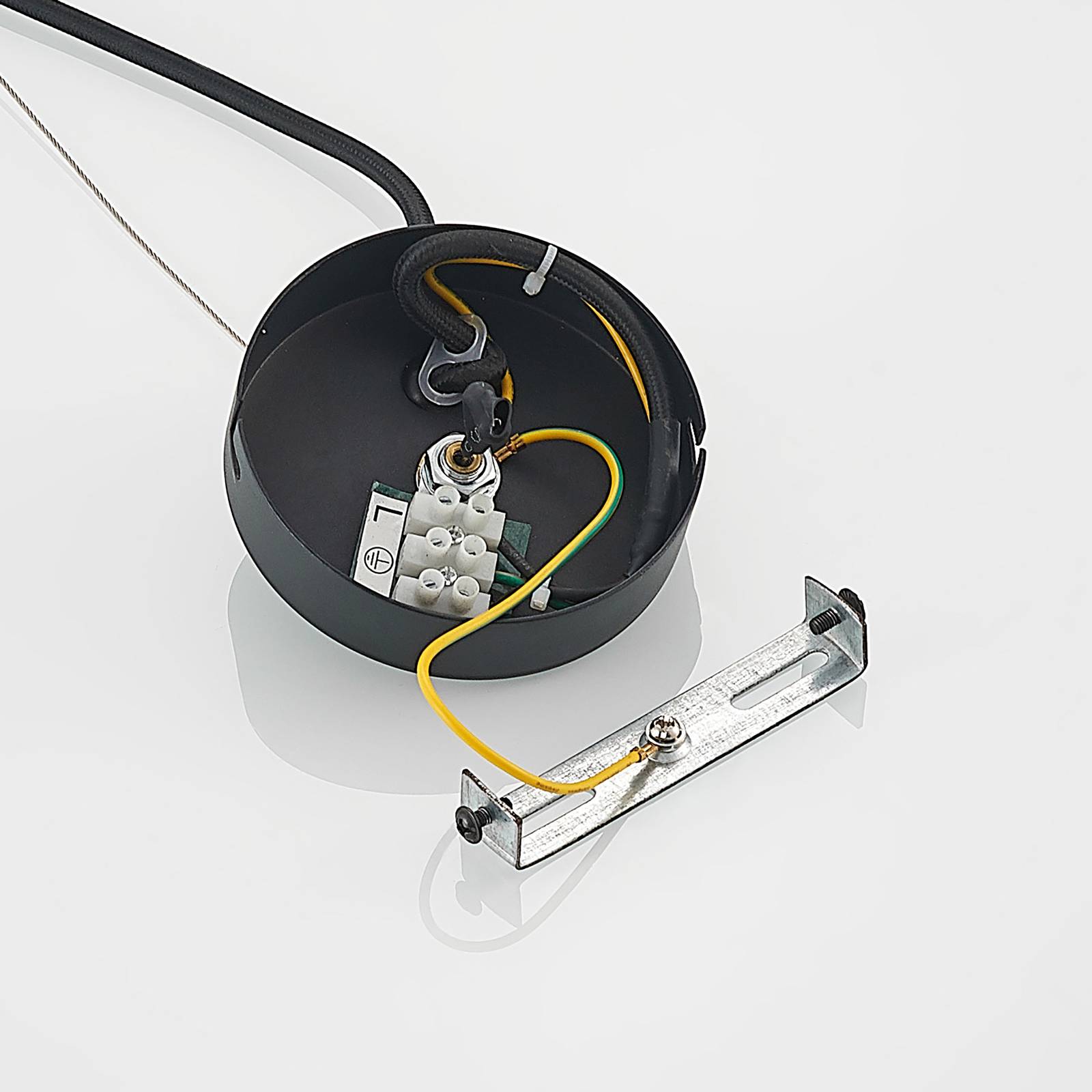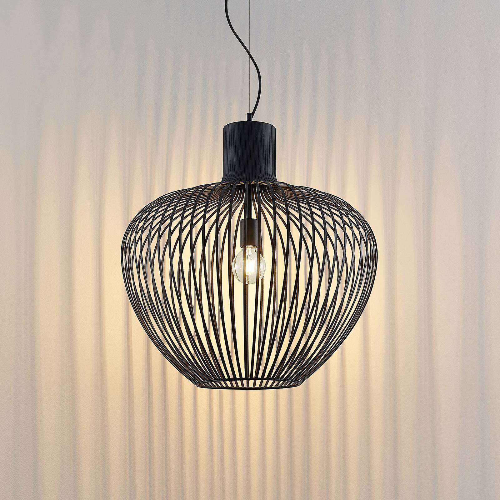 Lampada a sospensione Deandre nero-sabbia in acciaio con paralume a gabbia Deandre è una lampada a sospensione monolampada che trova la sua collocazione perfetta in un soggiorno o in una sala da pranzo. È realizzato in acciaio e presenta una colorazione nero sabbia che ne completa il design. La forma del paralume ricorda una gabbia e può essere dotata di fonti luminose adeguate. La scelta dell'illuminante permette di adattare l'intensità e il colore della luce alle esigenze personali, consentendo così un'illuminazione perfettamente coordinata. La lampada a sospensione Deandre crea un emozionante gioco di luci con il suo aspetto a gabbia, poiché la luce generata viene rifratta dagli stretti montanti del paralume e piacevolmente distribuita nell'ambiente.