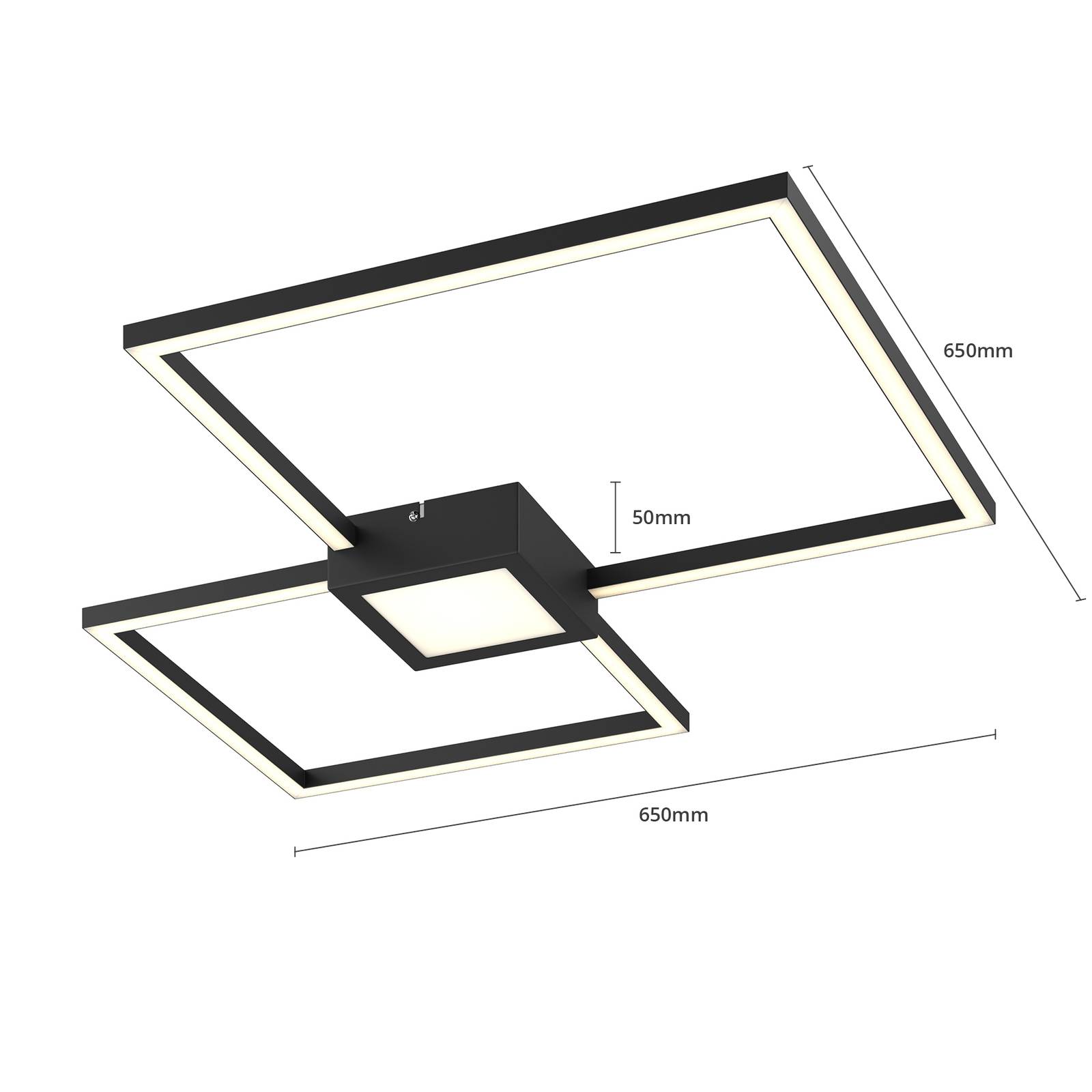 Lampada da soffitto LED Duetto dimmerabile con due cornici quadrate color antracite e funzione stepdim Duetto è una lampada da soffitto LED che convince per il suo look molto moderno. Le due cornici di forma quadrata sono in filigrana e si collegano al centro per formare un tutt'uno. Lì si trova un ulteriore elemento luminoso, anch'esso di forma quadrata. Tramite il normale interruttore a parete, normalmente presente ovunque, è possibile regolare la luminosità della plafoniera a LED in modo comodo e in tre fasi. Il colore antracite della superficie ha un aspetto molto nobile e può essere abbinato a numerosi arredi moderni. 3-step-dim off: tramite un interruttore a parete, è possibile accendere e spegnere l'apparecchio come di consueto. Grazie alla tecnologia di dimmerazione a 3 fasi con funzione di spegnimento integrata, è inoltre possibile regolare la luminosità a tre diversi livelli premendo più volte l'interruttore: 100 %, 50 % e 25 %.