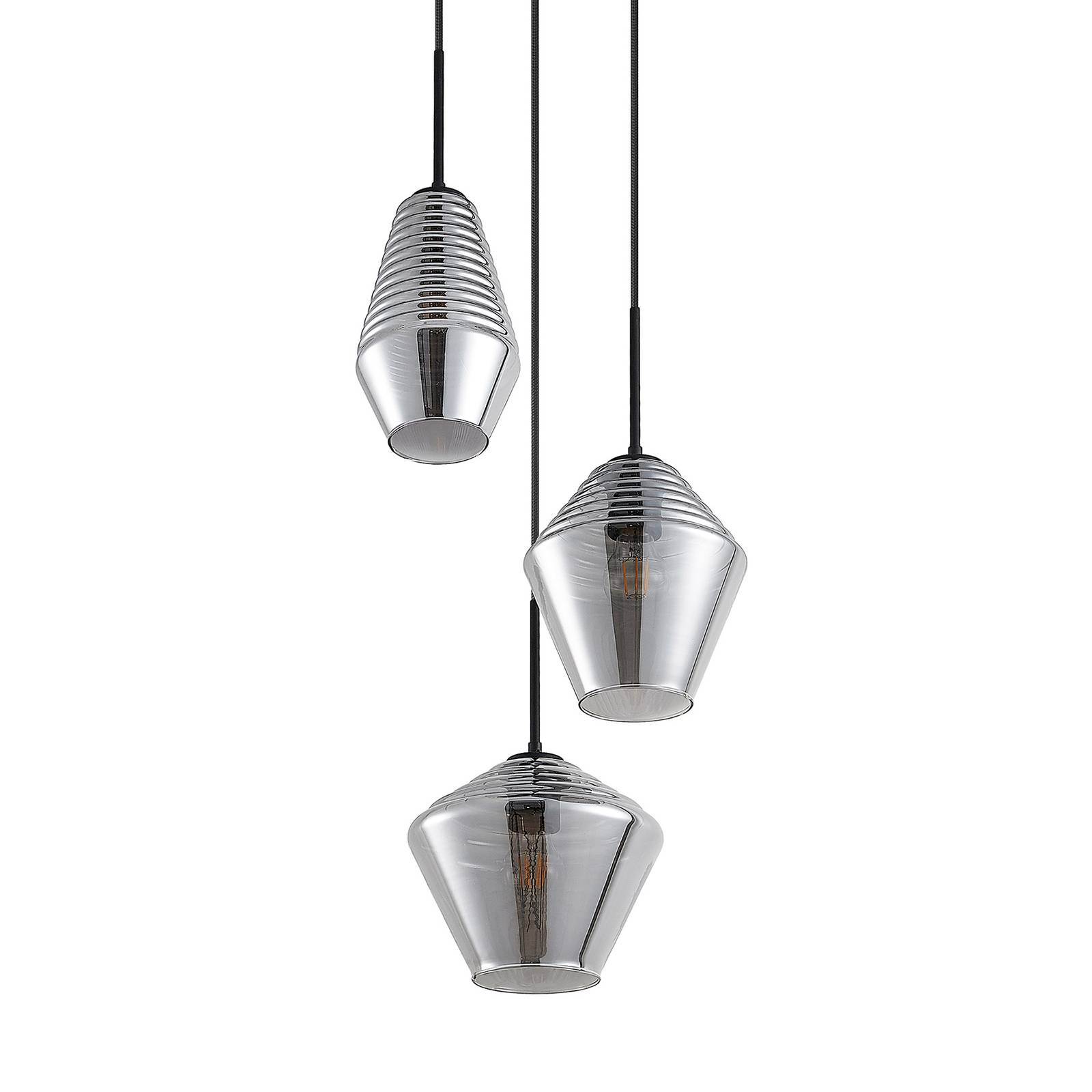 Lampada a sospensione a tre lampade Ekkis con paralumi in vetro grigio fumo e montatura nera Ekkis è ideale per gli interni dal sapore vintage perché ha paralumi in vetro trasparente grigio fumo di forma diversa, ma tutti rotondi e con una struttura scanalata nella parte superiore che allenta e personalizza il design. La tonalità grigio fumo del vetro rende la luce più calda e accogliente e crea accenti speciali. La lampada a sospensione può essere utilizzata bene nella zona pranzo o sopra un tavolino da caffè. Poiché si guarda direttamente nei paralumi, è opportuno utilizzare sorgenti luminose decorative, come ad esempio gli efficienti filamenti LED o le lampade rustiche con bulbi in vetro trasparente