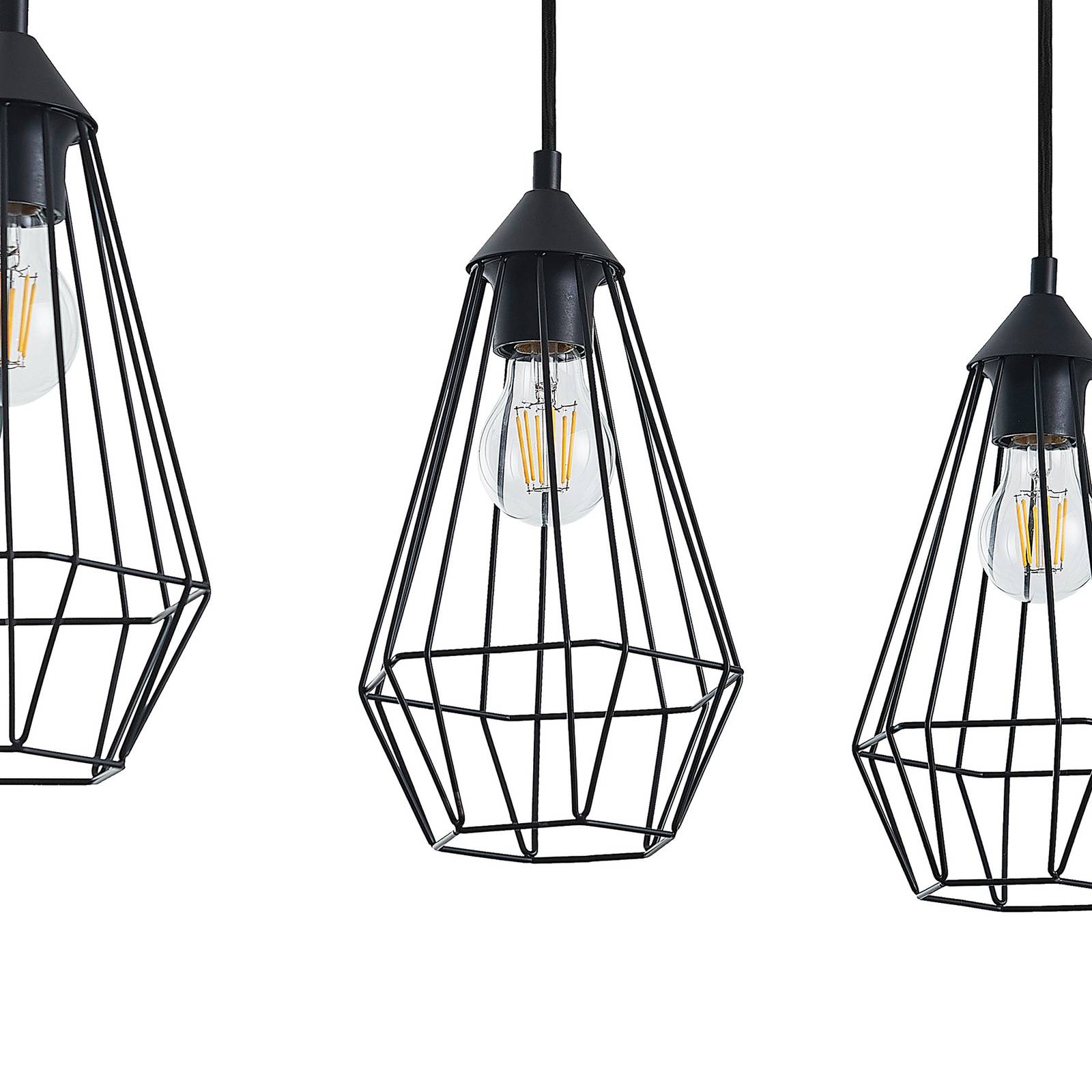 Lampada a sospensione a tre luci Elainy con paralumi decorativi a gabbia Le tonalità aperte, a forma di gabbia, della lampada a sospensione Elainy sono costituite da singoli montanti metallici e permettono una chiara visione delle fonti di luce. Sembrano ancora più decorativi quando sono dotati di lampade a filamento. Le tonalità sono appese a cavi rivestiti di tessuto alla lunga asta di legno di eucalipto e possono variare la loro sospensione avvolgendo il cavo intorno all'asta di legno. La combinazione di materiali tra legno e ferro laccato nero opaco rende la lampada a sospensione Elainy una lampada a sospensione di tendenza che si adatta a molti interni, dal living giovane al moderno stile country house.