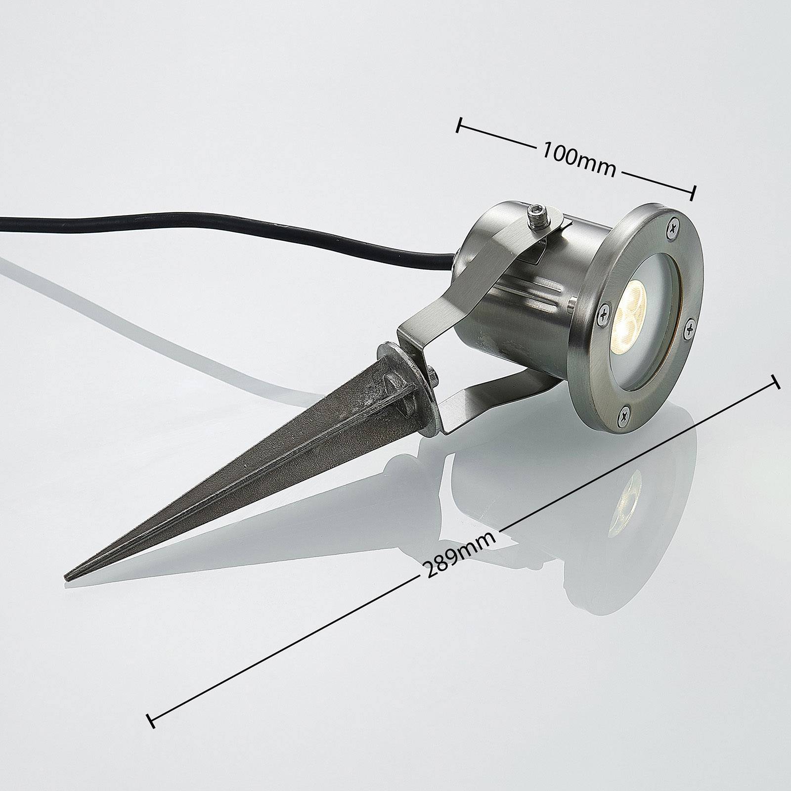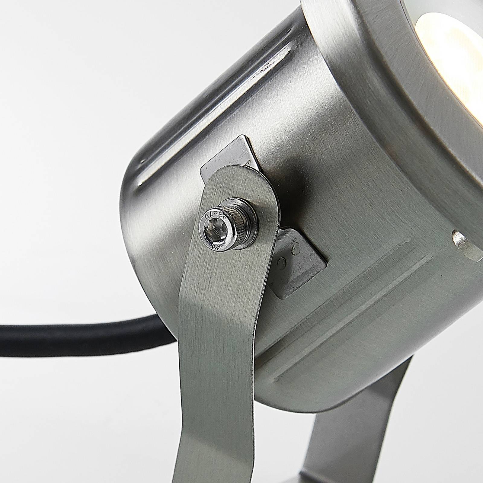 Faretto con picchetto LED Mathis in acciaio inox con corpo illuminante orientabile e grado di protezione IP65 Grazie all'alto grado di protezione, Mathis è un faretto resistente all'acqua e allo sporco, idoneo all'impiego in ambiente esterno. Il picchetto integrato consente di conficcare semplicemente il faretto nel terreno in un punto a piacere del giardino. I faretti con picchetto vengono spesso utilizzati per mettere in risalto determinati oggetti in giardino. L'angolo di emissione è di 50° e il corpo illuminante può essere orientato. La struttura in acciaio inox (V2A) conferisce eleganza al faretto, che viene fornito completo di cavo di alimentazione da 3 m e spina Schuko.