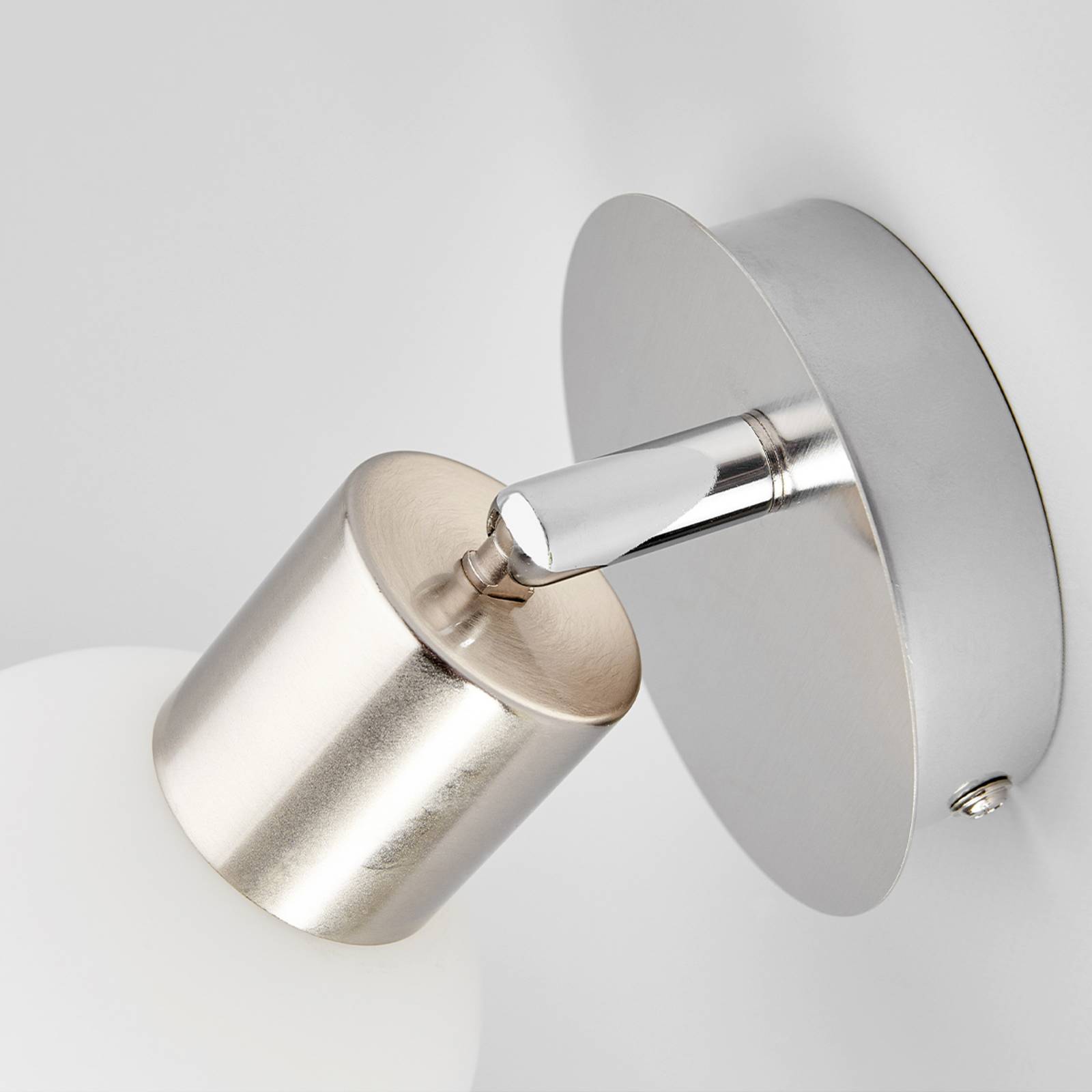 Bellissima lampada da parete in vetro opalino Elaina per lampadina E14 Il paralume sferico di questa lampada da parete è realizzato in vetro opalino, in modo da garantire una luce morbida e piacevole. Direttamente sulla montatura si trova un interruttore a levetta che consente di azionare rapidamente la lampada, per questo motivo è particolarmente consigliata per il montaggio sopra una poltrona o un letto. La lampada può essere dotata di lampadine E14