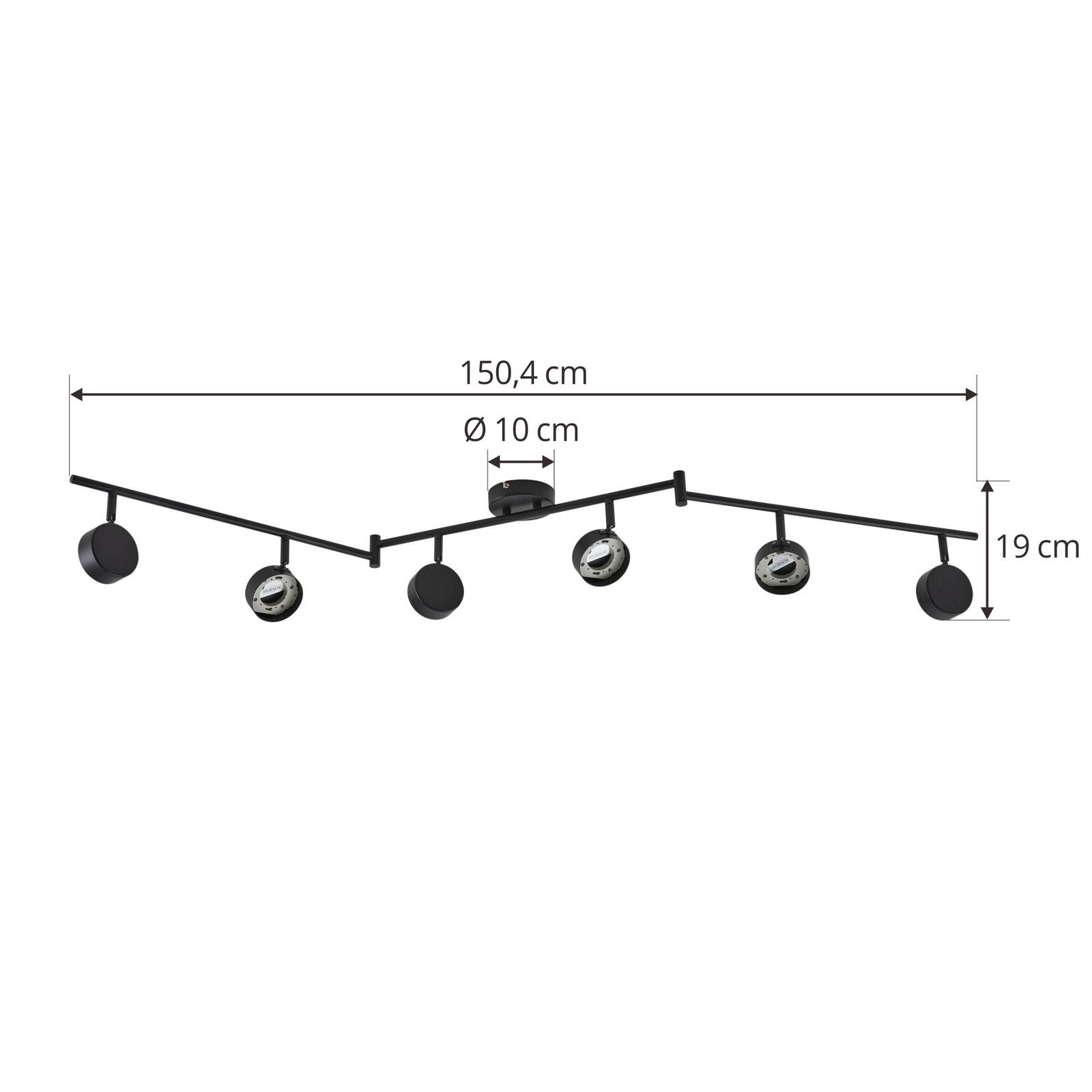 Faretto Jyla dimmerabile con sei paralumi regolabili Il faretto da soffitto Jyla a 6 luci è realizzato in ferro e aggiunge un tocco sofisticato all'ambiente circostante con il suo esterno nero. Allo stesso tempo, grazie al suo design discreto, si integra perfettamente in diversi ambienti. Ad esempio, è ideale come fonte di luce in corridoio, cucina, soggiorno o sala da pranzo. La struttura può essere regolata in tre punti e i paralumi rotondi possono essere inclinati e ruotati in modo flessibile. In questo modo è possibile personalizzare la luce e illuminare l'ambiente in modo ottimale. Le sorgenti luminose GX53 in dotazione hanno una lente curva e sembrano quindi delle semisfere di vetro. La luce può essere accesa e spenta come di consueto utilizzando un interruttore a parete. Grazie alla tecnologia di dimmerazione a 3 fasi con funzione di spegnimento integrata, può essere dimmerata anche a tre diversi livelli di luminosità premendo p