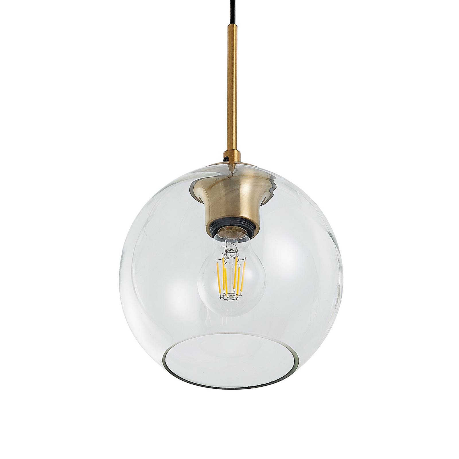 Lampada a sospensione Grady a tre lampade con paralumi in vetro trasparente e dettagli in acciaio in bronzo I paralumi in vetro di questa lampada a sospensione sono di forma sferica e hanno una superficie molto chiara, in modo che la luce possa penetrare senza ostacoli verso l'esterno e nulla della sua luminosità vada perduto. Sono completati da elementi in bronzo, ben visibili attraverso il vetro trasparente, che completano efficacemente il design complessivo. Anche le sorgenti luminose sono una parte visibile del look e dovrebbero quindi essere scelte in modo che si abbinino il più possibile e abbiano un aspetto decorativo, come nel caso in particolare delle lampade a filamento LED, che con il loro bulbo di vetro ricordano le vecchie lampade a incandescenza. Il design in vetro e i globi rotondi si abbinano bene anche a stili di arredamento vintage e la lampada a sospensione fa una figura di prim'ordine sopra un tavolo da pranzo o un bancone. La luce è luminosa e radiosa e può essere resa più accogliente da lampade con una tonalità di luce particolarmente calda.