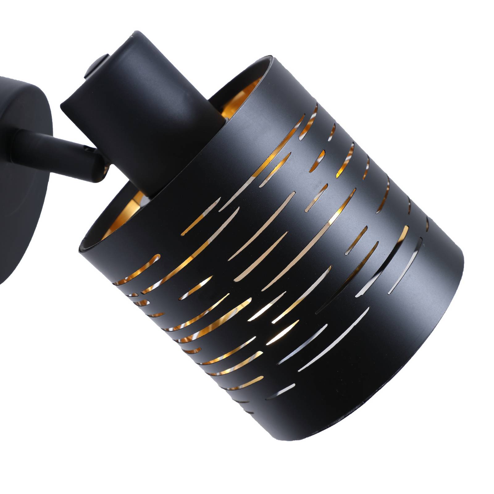 Piccola lampada da parete Iolyn con paralume nero e oro Ideale come lampada da lettura o luce notturna può servire la lampada da parete Iolyn, che è dotata di un piccolo interruttore direttamente sul supporto a parete. Quindi può essere acceso o spento direttamente da seduti o sdraiati. Visivamente, Iolyn ha un design elegante e moderno. Il paralume è dotato di piccole aree traforate, che permettono una visione discreta dell'interno. Poiché questo è dotato di colore dorato all'interno e del classico nero all'esterno, questi luoghi forniscono un aspetto speciale, che entra in gioco quando la luce è accesa.