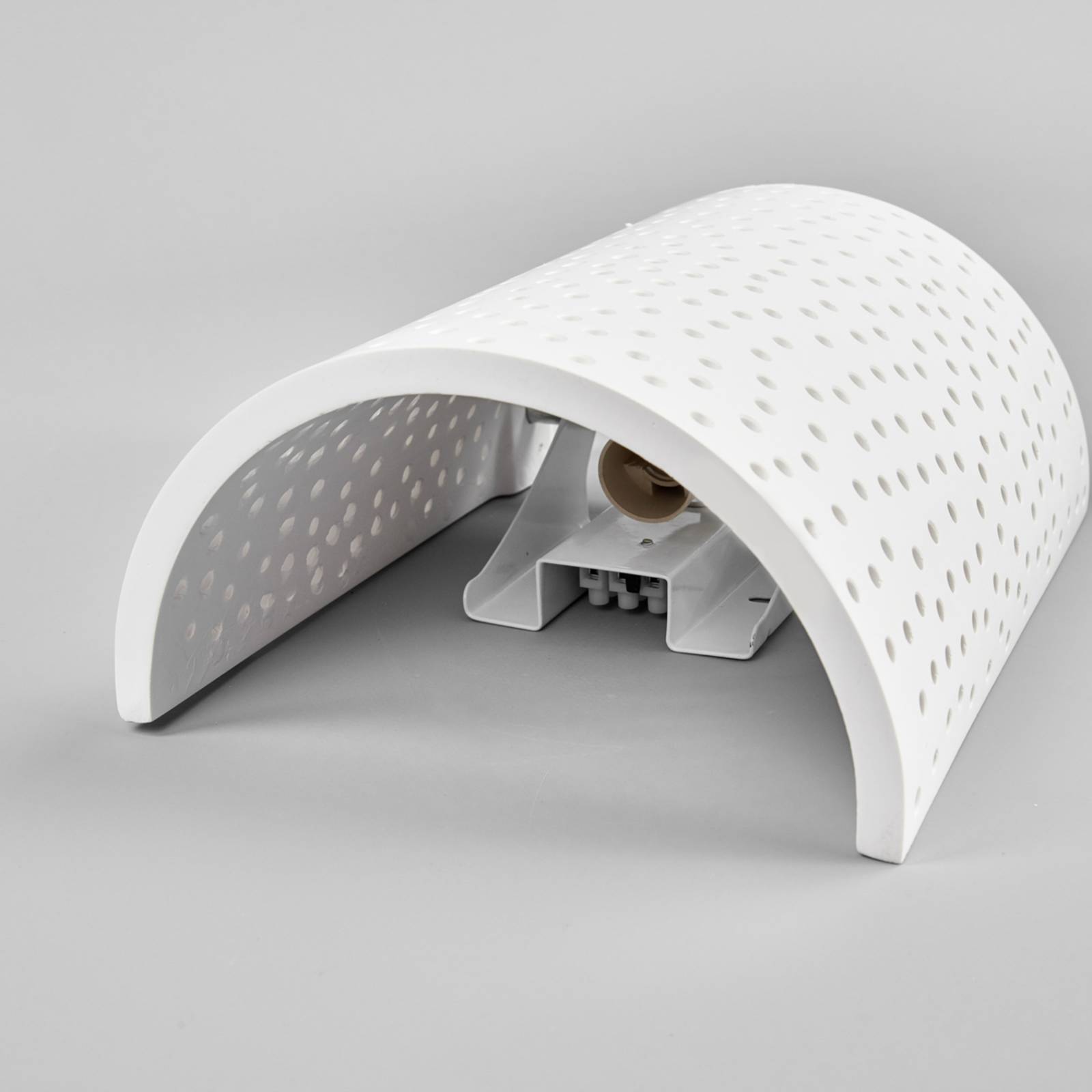 Applique Jiru di gesso, con decorativa lavorazione perforata Lo schermo di quest'applique di gesso è morbidamente incurvato. La luce viene emessa quasi interamente verso l'alto e verso il basso. Il gesso però non è compatto bensì lavorato con innumerevoli forellini. Ne deriva una bella estetica ma anche uno straordinario effetto di luce, visto che nell'ambiente si proiettano punti luminosi che scintillano artisticamente come stelle. Di conseguenza la lampada Jiru è perfetta soprattutto per un'illuminazione integrativa o d'accento. Chiaramente non può fungere da luce principale ma serve a creare atmosfera.