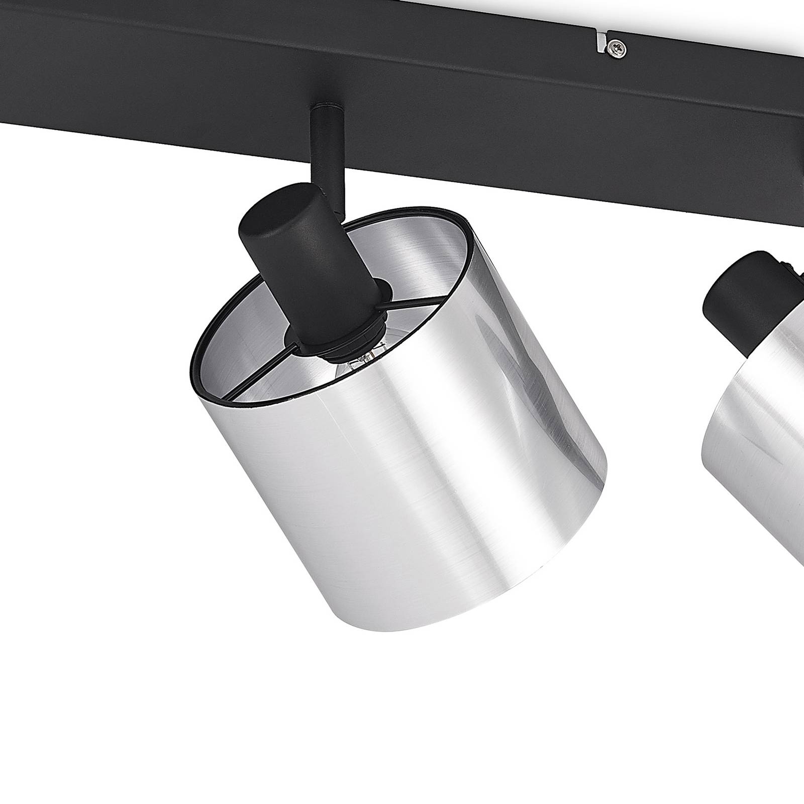 Lampada da soffitto a quattro luci Joudy con paralumi mobili in PVC in look alluminio spazzolato Joudy ha quattro tonalità di forma cilindrica, che possono essere ruotate e orientate a piacimento e possono essere dotate di lampade E14 di vostra scelta. Sono fatti di una plastica PVC che è colorata in un colore alluminio e quindi ha un bel luccichio metallico. Il materiale è relativamente sottile, in modo che lo splendore della luce quando la lampada è accesa può ancora penetrare delicatamente attraverso il materiale dell'ombra verso l'esterno. Il risultato è un look particolarmente moderno che corrisponde bene a molti stili contemporanei ed è sempre bello da vedere in soggiorno, in un corridoio o in cucina. Le prese E14 possono essere equipaggiate con lampade a piacere, volentieri anche con efficienti lampade a filamento LED, che sono otticamente molto simili alle classiche lampade a incandescenza.