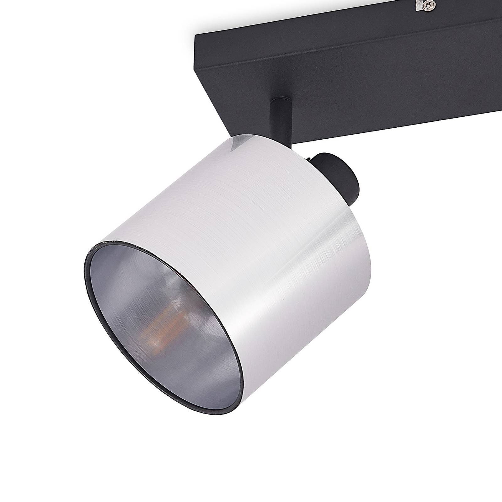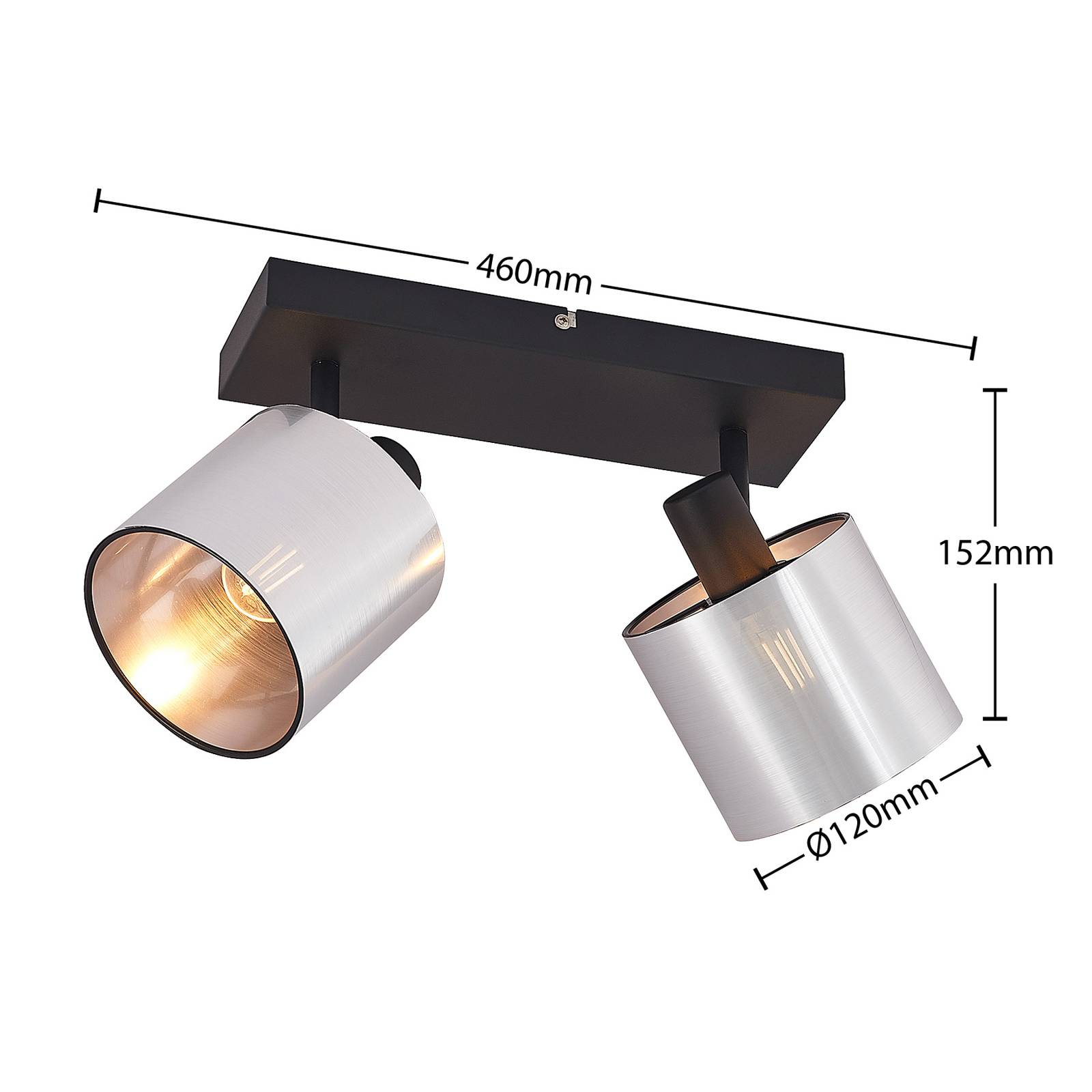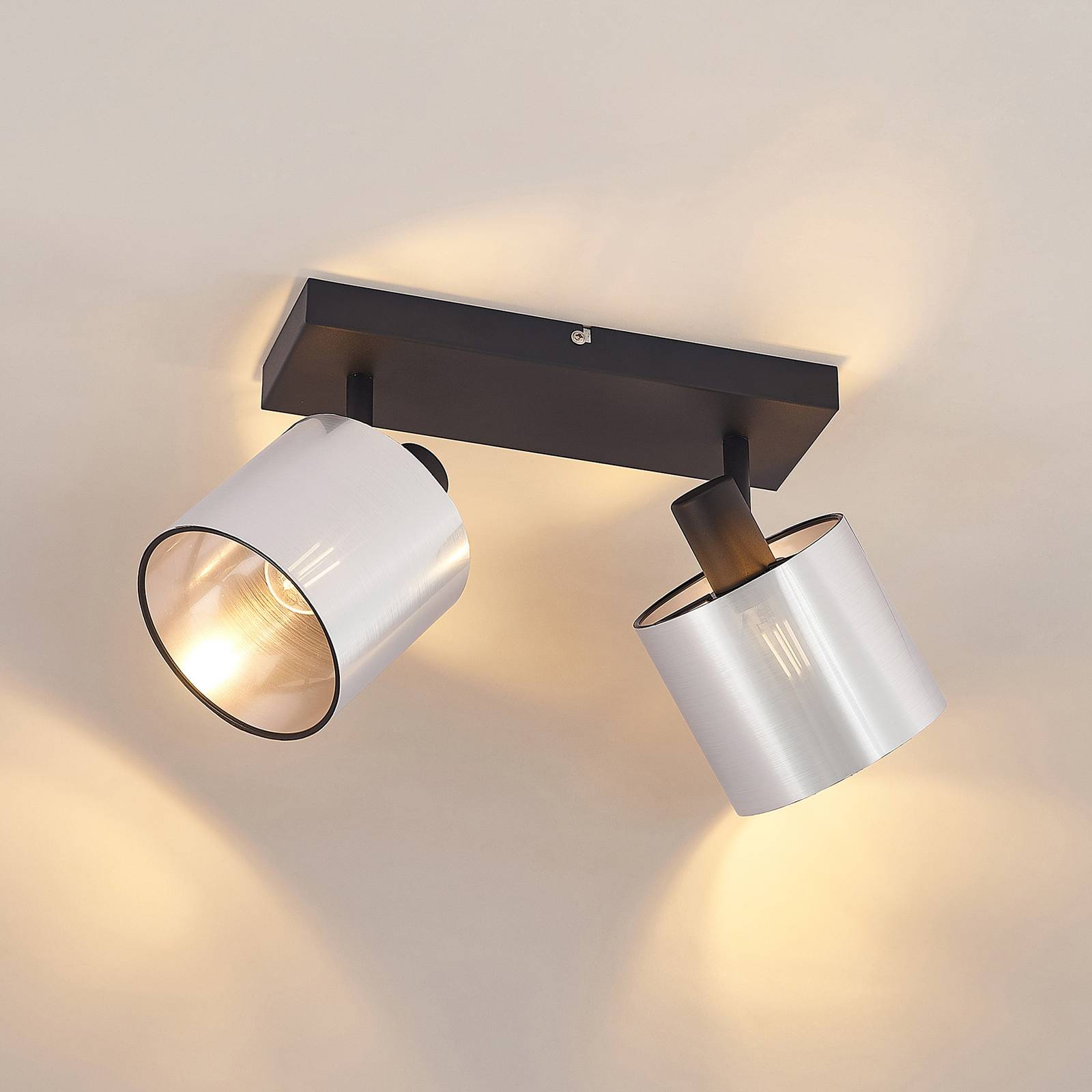 Lampada da soffitto a due luci Joudy con paralumi color alluminio di forma cilindrica Joudy è una lampada da soffitto con due tonalità, che è particolarmente adatto per le stanze più piccole o aree in una stanza. Funziona con due lampade E14 a scelta e ha una struttura in metallo nero opaco, mentre i paralumi sono stretti e cilindrici e fatti di plastica sottile. Questo ha l'effetto di mantenere una certa traslucenza e di creare un effetto di luce morbida. Le tonalità hanno un design superficiale argenteo con un'attraente finitura a pennello che si presenta come molto elegante e di classe.