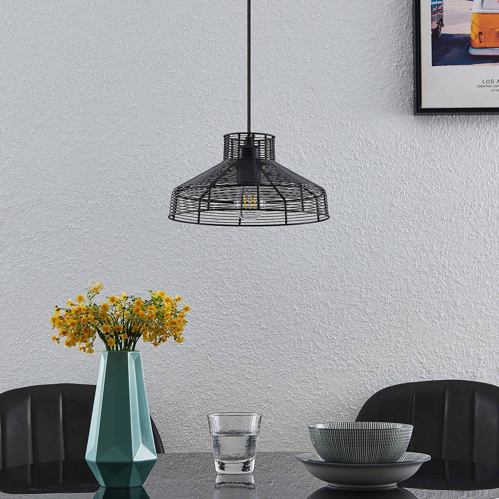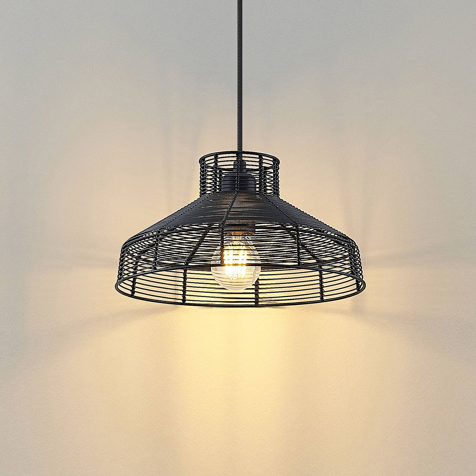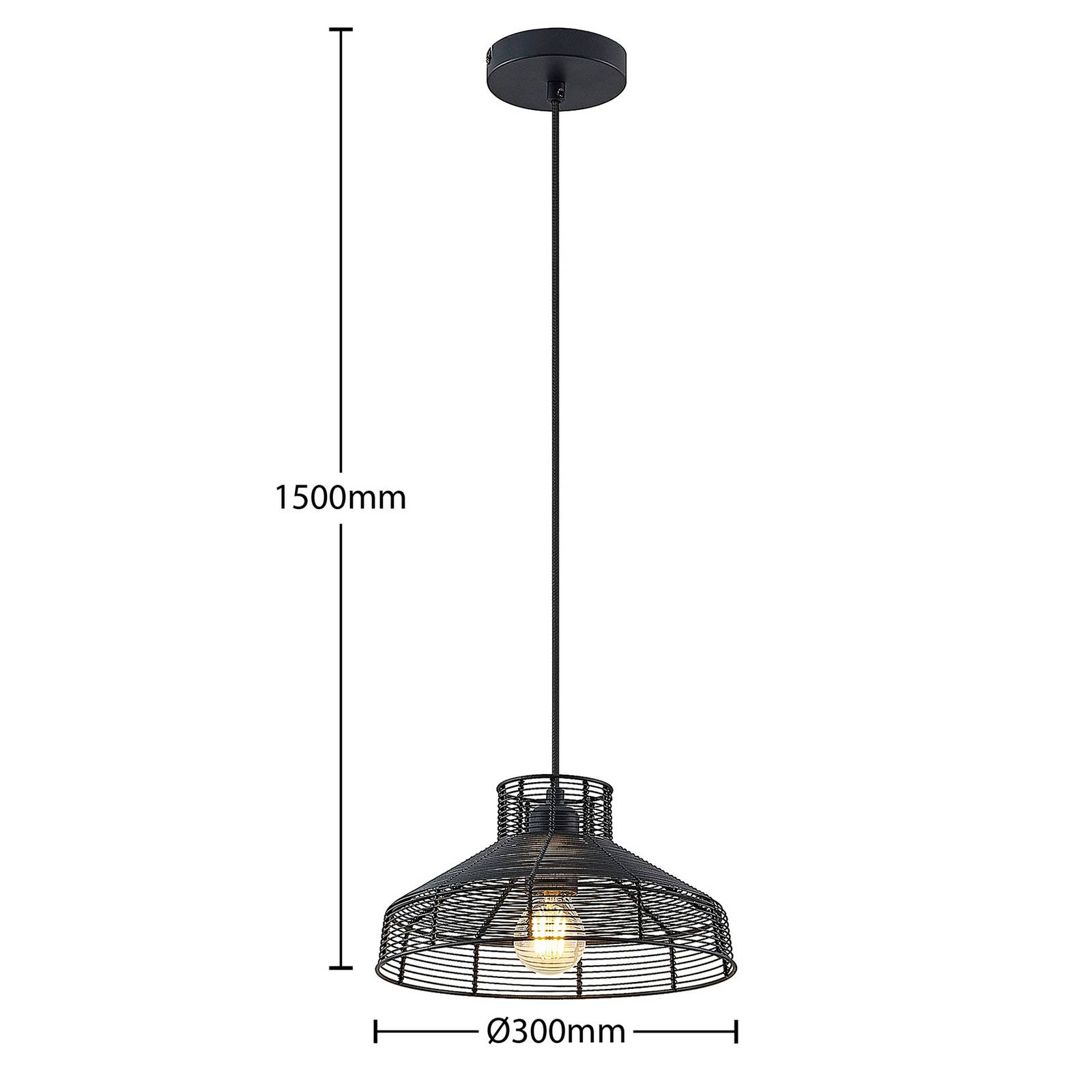 Lampada a sospensione a una luce Karidotta in acciaio La lampada a sospensione Karidotta è disponibile in un look scuro. È fatto interamente in acciaio e ha un design particolare. La finitura superficiale nera sembra moderna ed elegante. I numerosi montanti del paralume creano uno speciale gioco di luci e ombre nella stanza.