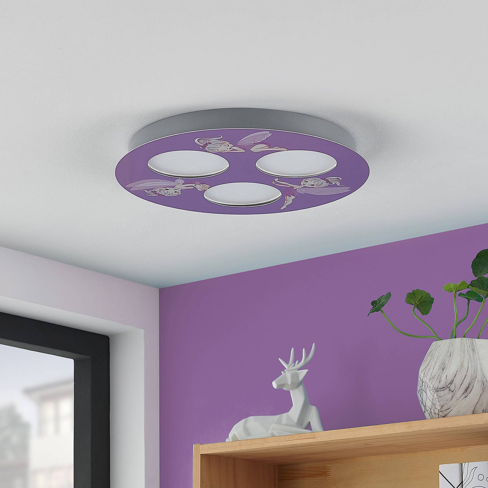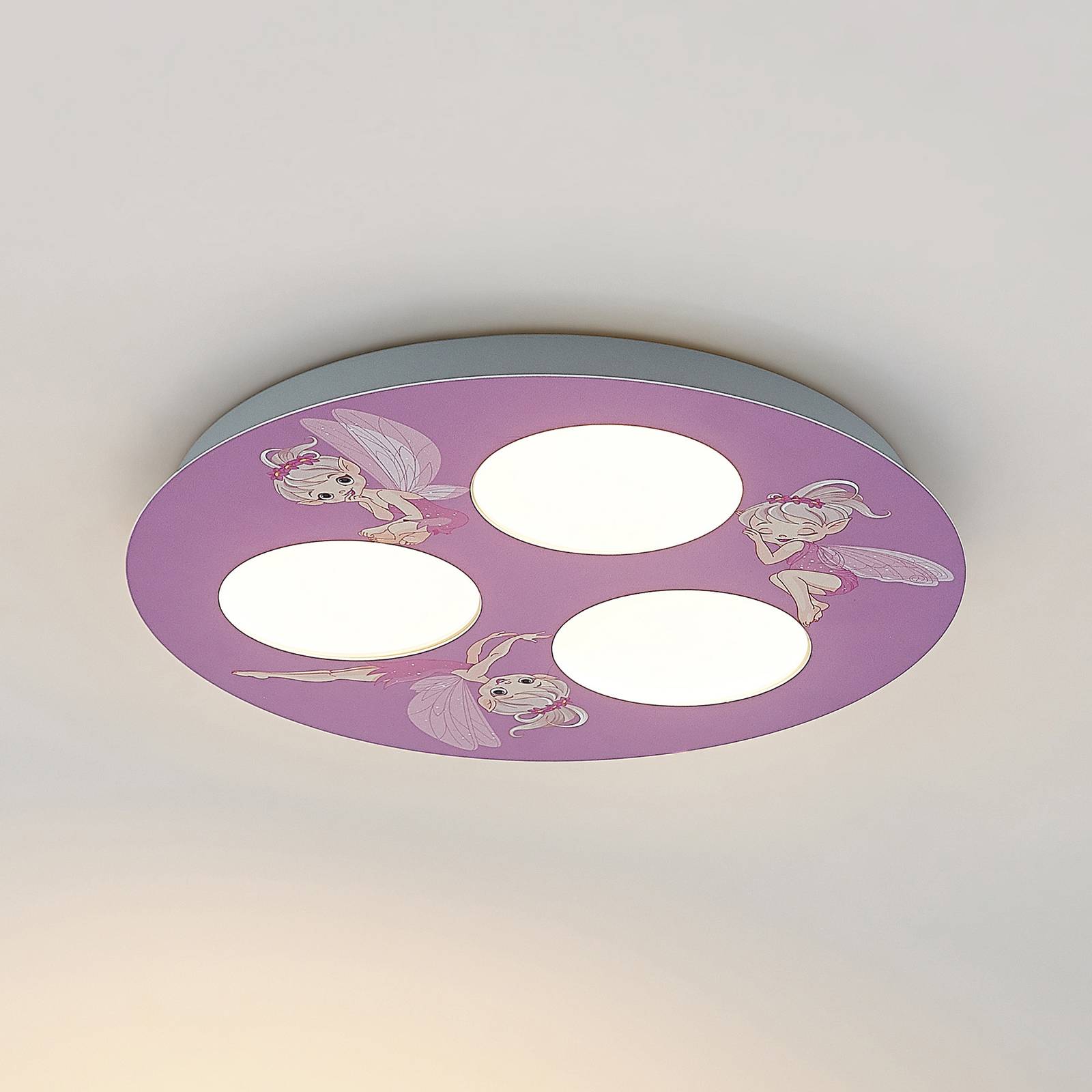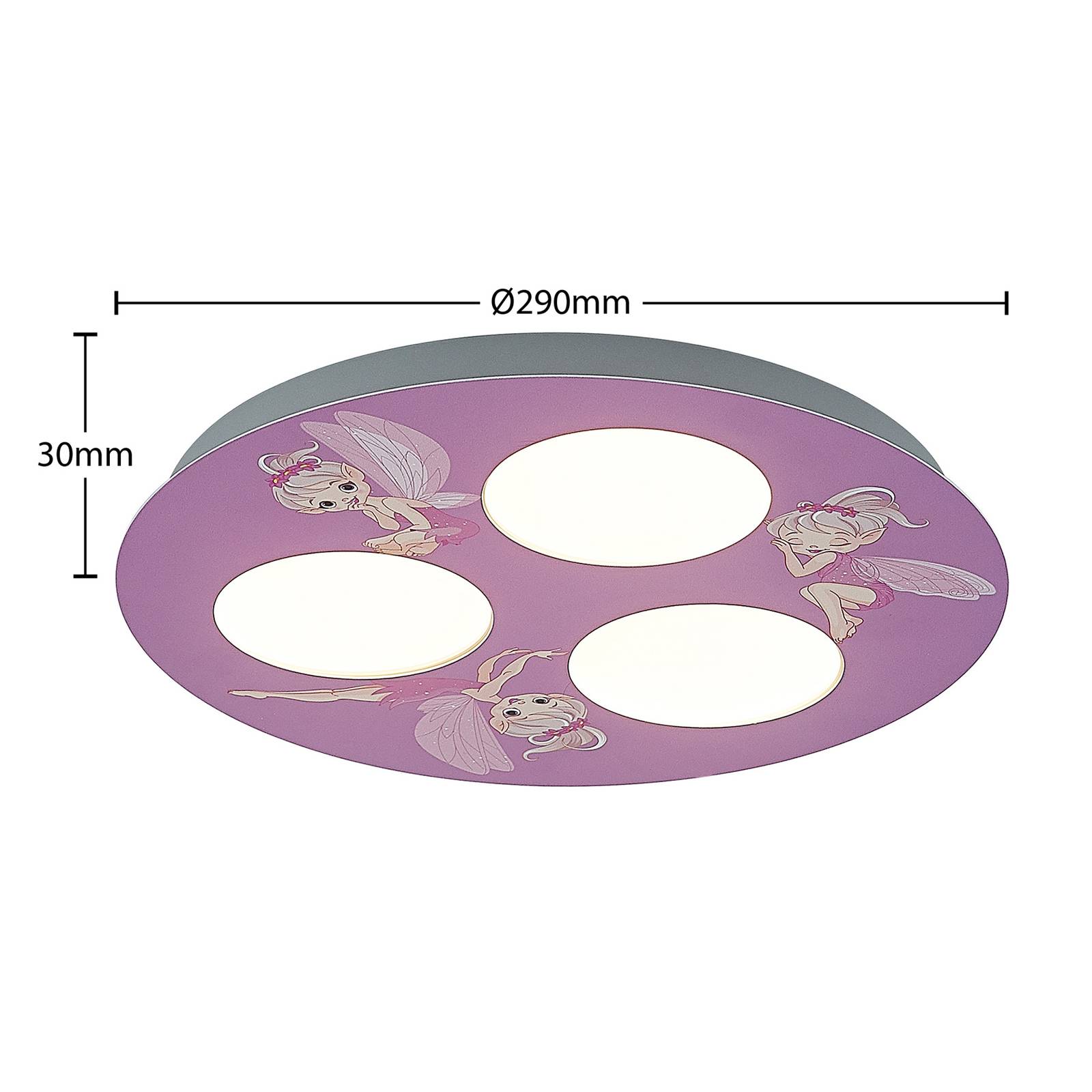 Plafoniera giocosa Kaydee in ottica fata rosa Kaydee è il compagno perfetto quando si tratta di illuminare la stanza di un bambino. Ha una forma rotonda in ferro ed è decorata in rosa. È adornato con tre rappresentazioni di una piccola fata, che gli conferisce un design giocoso. Viene fornito con lampadine dimmerabili che possono essere controllate in termini di luminosità. Attraverso un interruttore a muro, è possibile accendere e spegnere la luce come al solito. Grazie alla tecnologia di dimmerazione a 3 fasi con funzione di spegnimento integrata, può anche essere dimmerato a tre diversi livelli di luminosità premendo l'interruttore più volte: 100%, 50% e 3%. La plafoniera Kaydee diffonde un umore allegro all'interno e si integra bene negli stili d'interni giocosi con il suo colore accattivante.