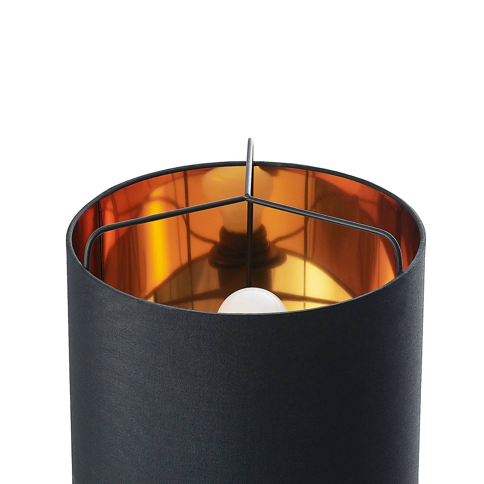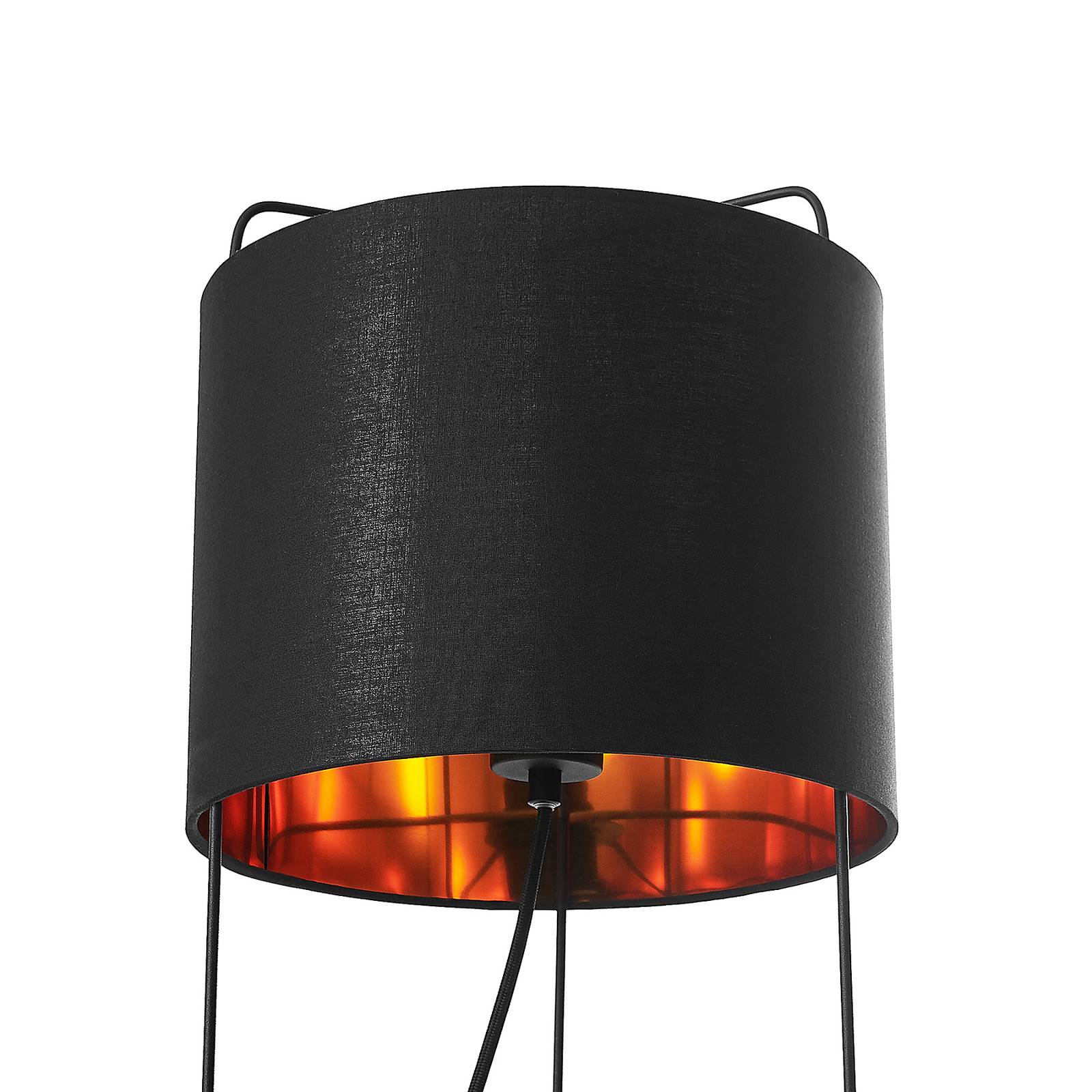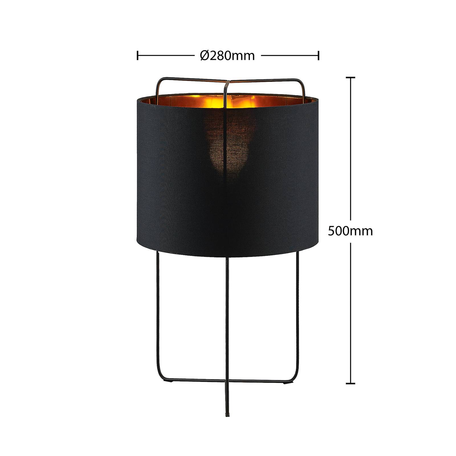 Lampada da tavolo Kesta nera e oro con paralume in tessuto e struttura in acciaio Kesta è una vera e propria fonte di luce degna di nota per molti interni moderni o giovanili, che si distingue per una particolare eleganza e un look sofisticato, che si presenta in filigrana e colpisce allo stesso tempo. Il paralume rotondo è realizzato in tessuto e convince con un contrasto cromatico di nero e oro. Mentre la lampada è nera e scura all'esterno, una bella lucentezza dorata all'interno è convincente, che non solo ha un bell'aspetto, ma influenza anche l'effetto di illuminazione in modo accogliente. Il telaio della lampada è nel frattempo molto filigranato e leggero ed è costituito da tre stretti puntoni d'acciaio, che sono uniti nella parte inferiore in una specie di piede. Una lampada da tavolo che può essere utilizzata sia in soggiorno che nella zona notte ed è adatta soprattutto per l'uso su tavolini medio-alti.