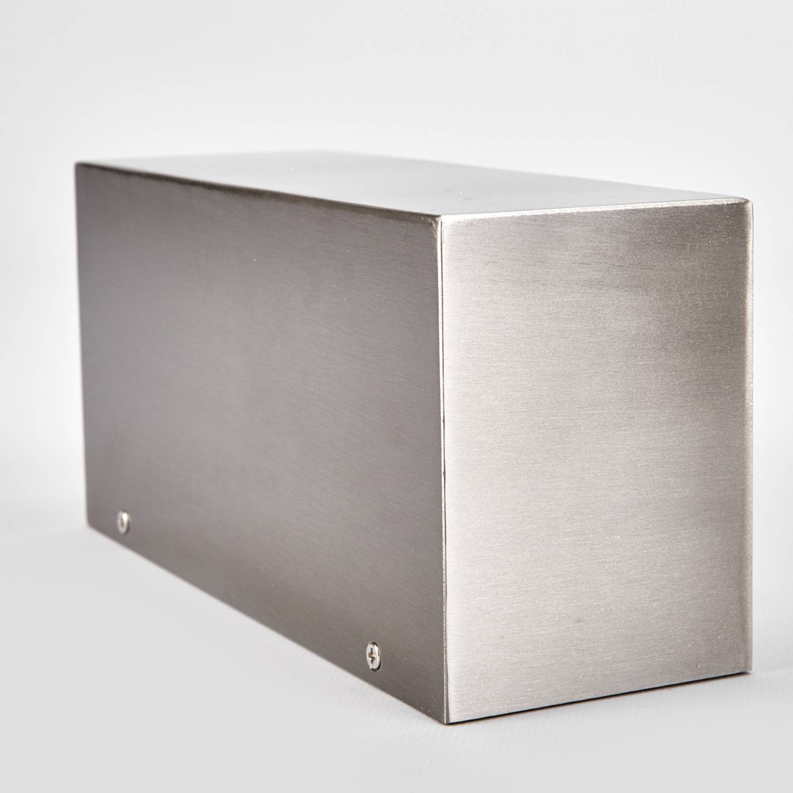 Discreta lampada da parete per esterni Leonora in acciaio inox e di forma lineare Con la sua esclusiva forma di parallelepipedo, la lampada da parete per esterni Leonora risulta contemporanea, piacevole e sobria. Il telaio in acciaio inox è integrato con una lastra di vetro al di sotto, che consente una distribuzione omogenea e gradevole della luce emessa dalla lampadina. Nelle aree esterne, Leonora fa sempre la sua figura ed è consigliabile per vari tipi di edifici.