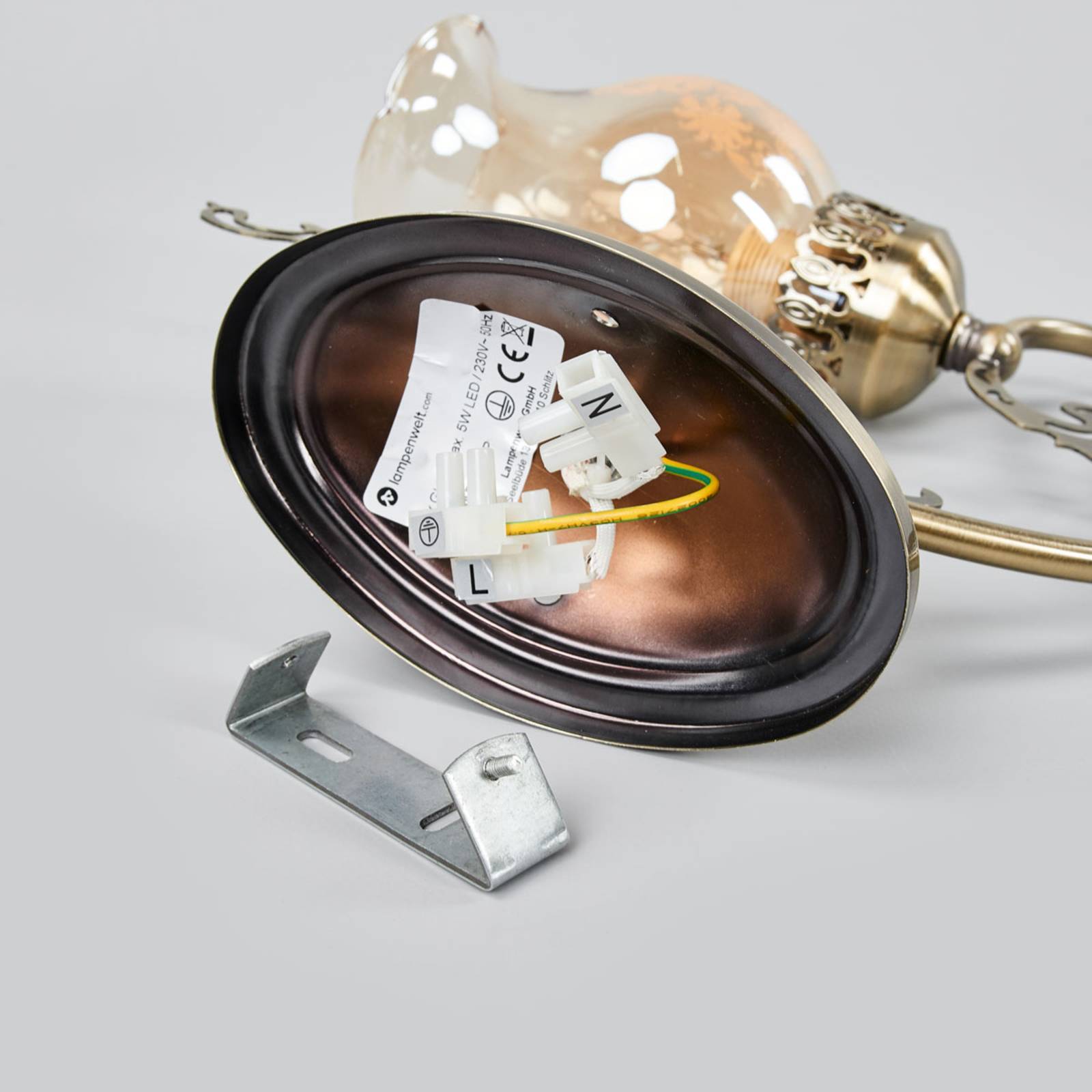 Applique Heti, estetica giocosa e fascino antico Heti è indubbiamente una lampada di stile classico che affascina per la sua ricchezza di dettagli. Ciò nonostante le forme del suo design riescono piuttosto giocose. Il supporto metallico presenta una finitura in ottone anticato che sembra veramente d'epoca, con uno schermo di vetro ambrato che diffonde una luminosità molto accogliente e suggestiva.