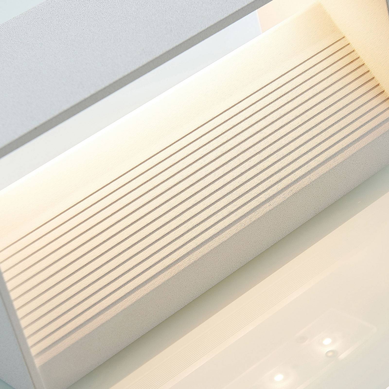 Lampada LED da parete Lonisa per un'illuminazione d'effetto Lonisa è una lampada da parete dalle forme essenziali: il corpo illuminante è quadrato, ma i bordi anteriori sono arrotondati, il che le conferisce un'armonia senza pari. La parte posteriore della staffa di metallo bianca alloggia numerosi LED, che illuminano il riflettore a forma di tetto. In questo modo si diffonde nell'ambiente una luce omogenea senza effetto abbagliante, indirizzata unicamente verso l'alto e verso il basso. Per il suo design purista e per la luce che emana, la lampada LED da parete Lonisa è perfetta per un ambiente arredato in stile moderno.