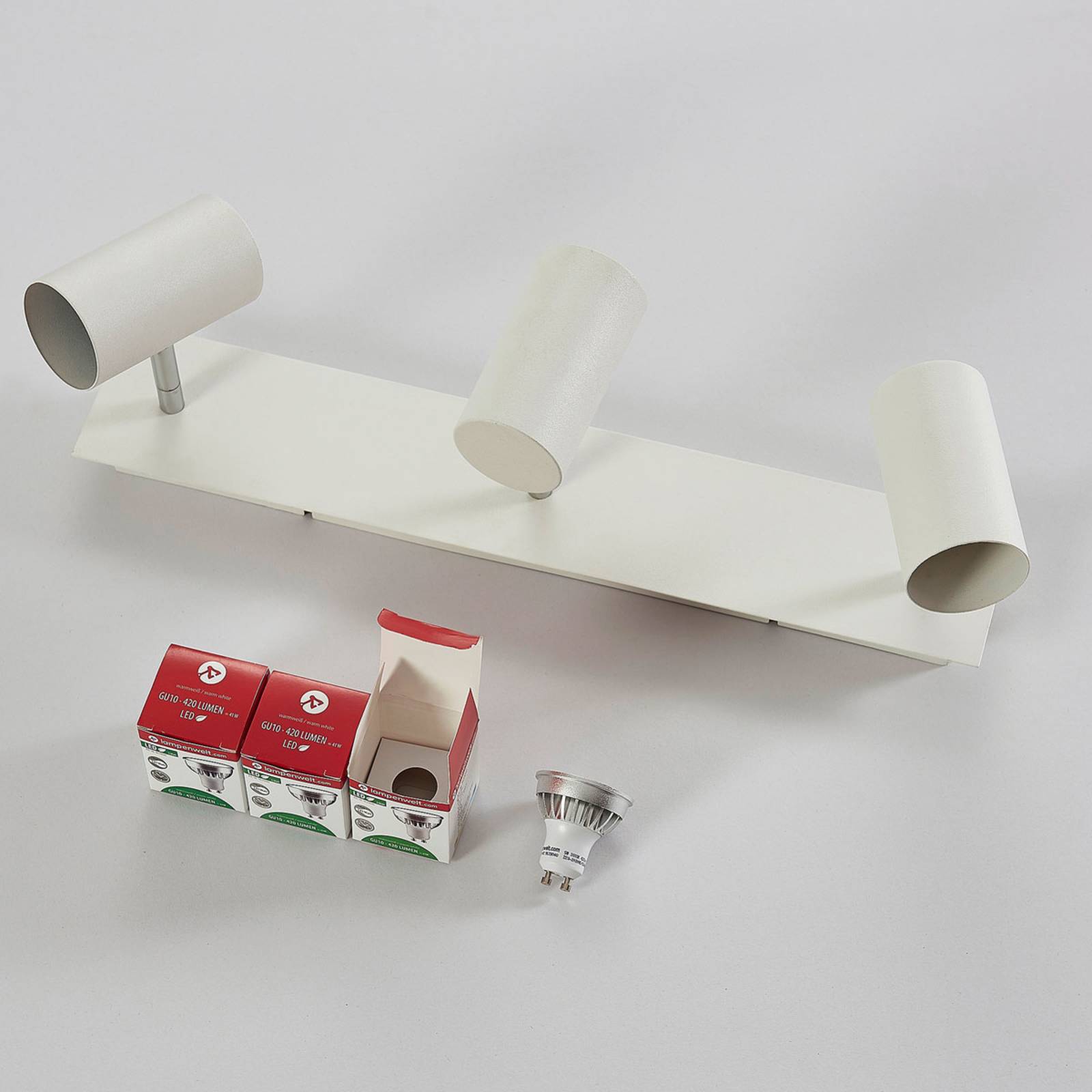 Lampada da soffitto bianca Iluk con teste luminose mobili di forma cilindrica Il design di questa lampada da soffitto è particolarmente intramontabile e quindi è possibile utilizzarla in molti ambienti e stili. Tutti e tre i paralumi sono cilindrici e possono essere ruotati e orientati per direzionare la luce. La lampada può essere dotata di lampadine GU10.