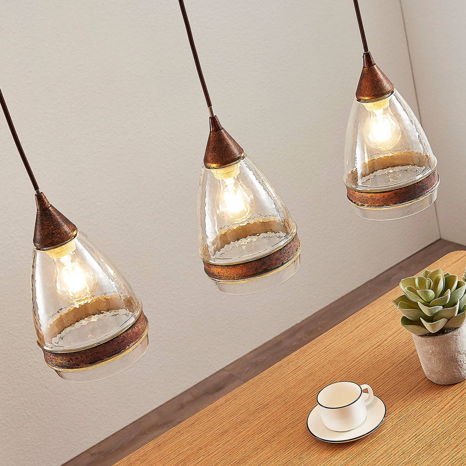 Lampada a sospensione Millina color ruggine con tre paralumi in vetro - ideale per illuminare un tavolo da pranzo Per la sua forma allungata, Millina è una lampada a sospensione a 3 luci perfetta per l'illuminazione di un tavolo. I paralumi sono realizzati in vetro finemente strutturato, decorati con elementi di metallo color ruggine. In questa lampada a sospensione a 3 luci, le lampadine a vista sono elementi fondamentali, pertanto si consiglia l'uso di modelli con tecnica a filamento o in stile rustico.