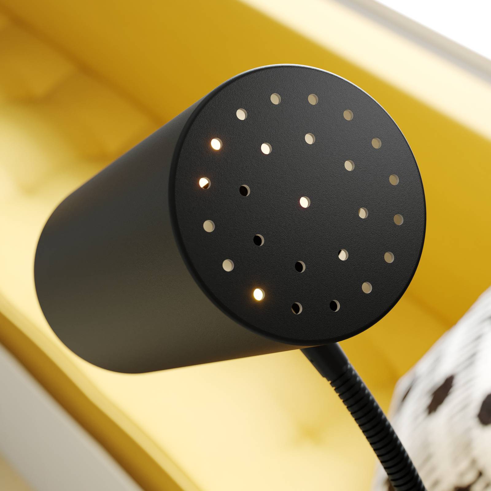 Lampada da terra Karoli nera con testa luminosa flessibile, ideale come complemento per interni minimalisti e stili di casa in un look orientato al design con un tocco scandinavoKaroli incarna un minimalismo elegante, perché qui non si notano dettagli superflui, ma un look purista con semplice gentilezza. Dalla testa ai piedi, l'intero corpo dell'apparecchio è realizzato in metallo e presenta una finitura scura in nero opaco, in grado di attirare l'attenzione. Il paralume non convince con forme opulente, ma al contrario con una moderna linearità, e con la sua forma cilindrica incarna un carisma universale che piace ancora dopo anni e non è soggetto a mode. La testa può essere orientata a piacere grazie al braccio flessibile, in modo da regolare l'emissione luminosa in pochi semplici passaggi. Soprattutto come lampada da lettura, la lampada da terra è l'oggetto preferito, ma anche la possibilità di emettere luce indiretta verso l'alto è immediatamente convincente.