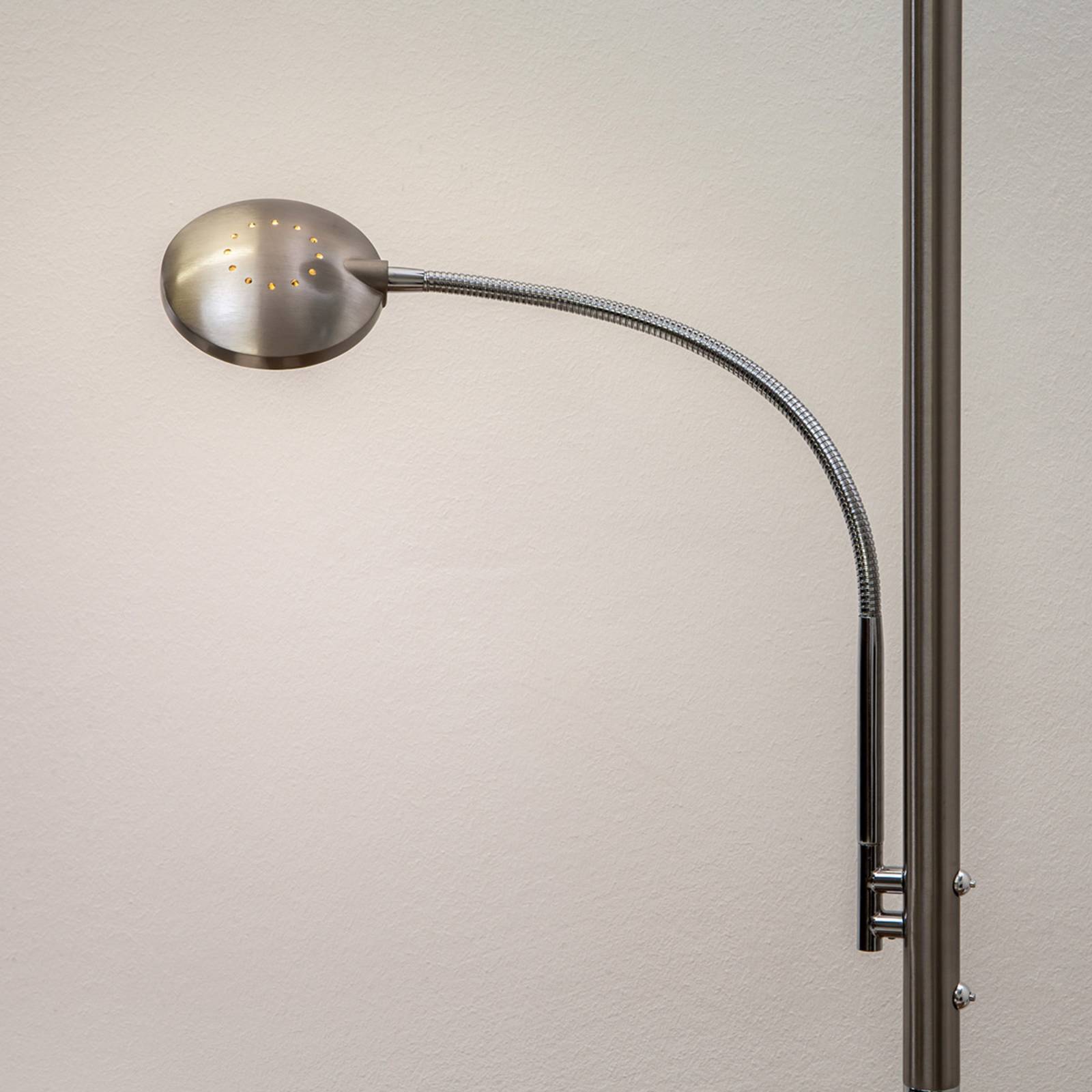 Lampada LED da terra Malea a forte intensità luminosa con pratica luce di lettura e dimmer Questa lampada LED da terra si contraddistingue per le numeroso caratteristiche funzionali. In primo luogo consente un forte risparmio energetico, grazie alla tecnologi a LED integrata. Oltre a illuminare l'ambiente con la piacevole luce indiretta del proiettore, Malea dispone anche di una pratica luce di lettura integrata nello stelo, che può essere orientata a piacere grazie al braccio flessibile. Entrambe le lampade, il proiettore e la luce di lettura, sono dotate di dimmer, per una regolazione ottimale dell'intensità della luce di colore bianco caldo. Basta tenere premuto il pulsante fino a raggiungere il livello desiderato. Il diffusore è protetto da una piastra in vetro satinato. Proiettore: 1805 lumen, lampada di lettura: 475 lumen