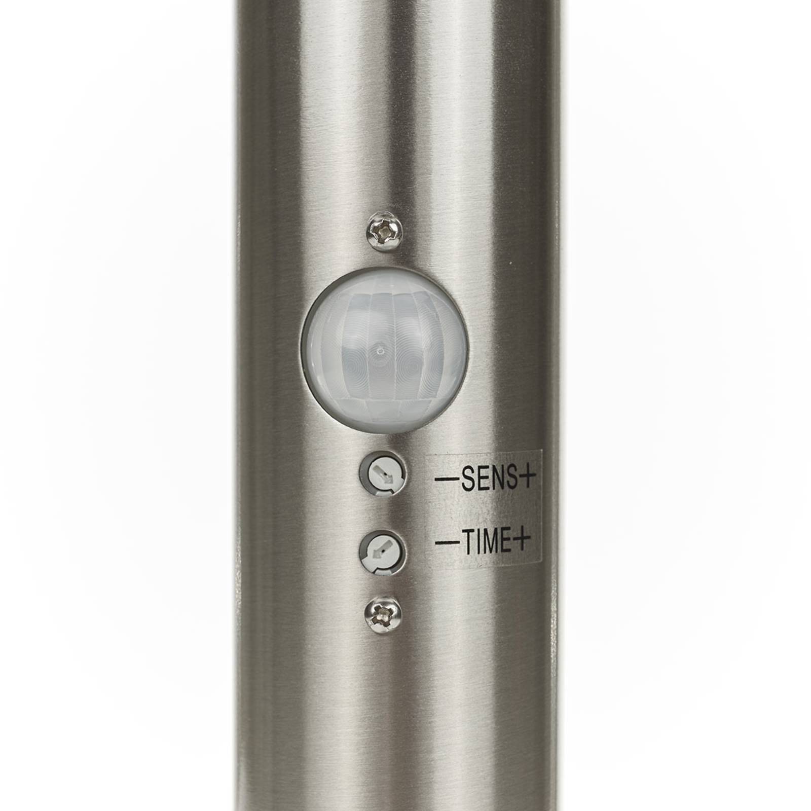 Luce da esterno Gregory con rilevatore di movimento: Lampada con base in acciaio inox e tecnologia LED Se una fonte di luce sulla proprietà deve essere attivata solo quando c'è un movimento nelle vicinanze, è necessario utilizzare una lampada da esterno con sensore di movimento. Se la luce LED deve risplendere al meglio e una lampada da esterno formosa deve avvolgere con la sua luce, la lampada a base LED Gregory è una buona scelta. Ha una finitura di alta qualità, è robusto e quindi sfida le intemperie in tutte le stagioni. Per il corpo è stata scelta una forma a lanterna, che si trova in cima alla base sottile e rotonda. Il sensore reagisce immediatamente al movimento e la luce LED fornisce un'illuminazione bianca calda. Dati del sensore: - Portata 5-7 m - Durata della luce (regolabile): 10 s - 4 min - Angolo di rilevamento 90°