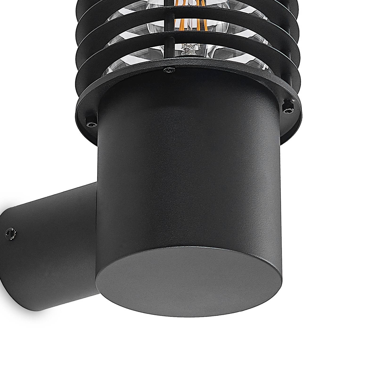 Lampada da parete cilindrica da esterno in acciaio inox Liddi in nero Liddi è una lampada da parete esterna compatta ed elegante che si integra senza sforzo nello stile architettonico di una casa. Il suo supporto a muro e il paralume sono in acciaio inossidabile nero e ha anche un diffusore in plastica trasparente. Questo circonda una presa in cui si può inserire una lampadina E27, che produce la luce necessaria. La classe di protezione IP44 rende la lampada da parete per esterni Liddi protetta dagli spruzzi d'acqua e perfetta per le pareti coperte nell'area esterna. Se necessario, può essere combinata con altre luci della sua serie per creare un'impressione generale coerente.