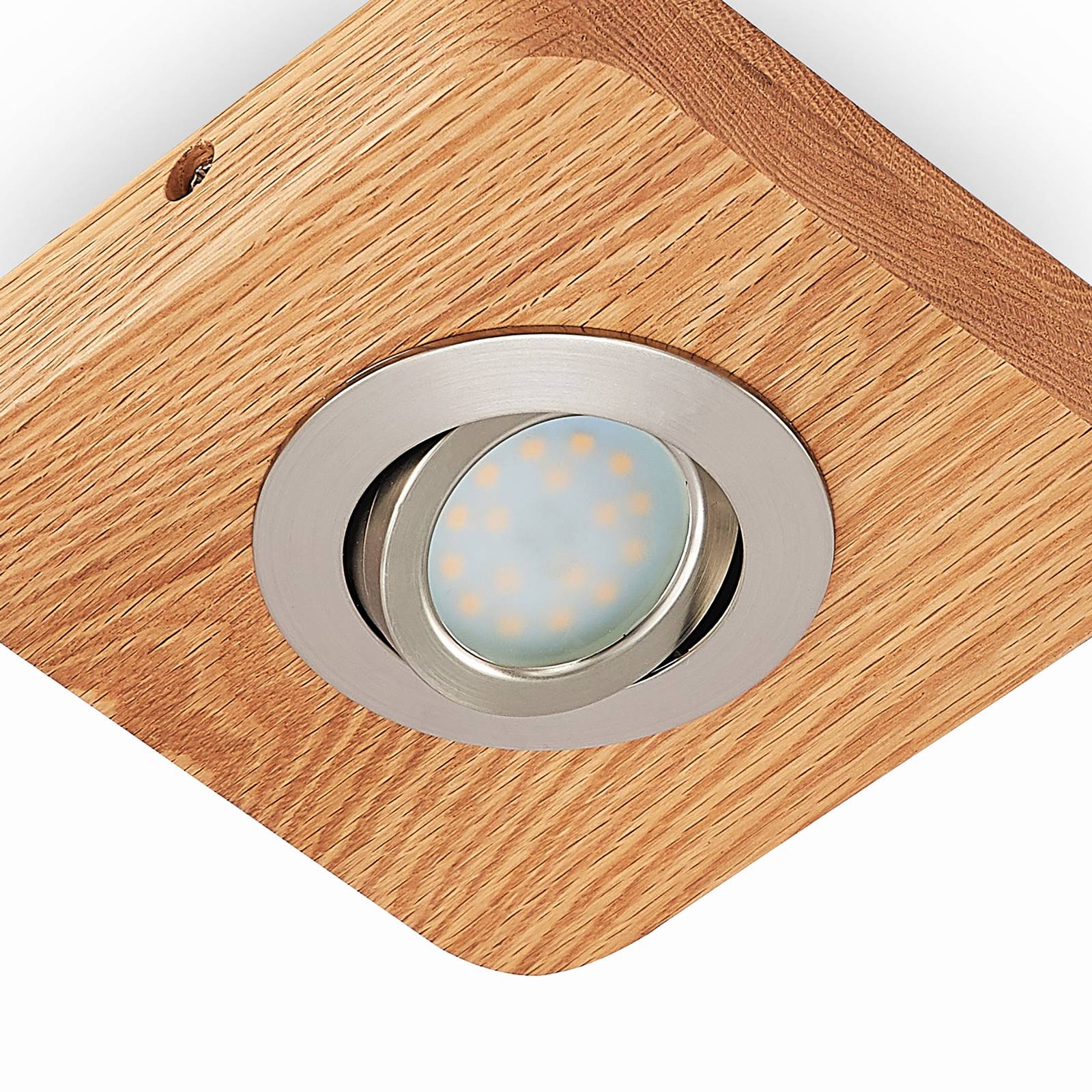 Piccolo faretto LED Mikari in bellissimo legno di quercia Questa luce moderna convince per il suo uso pratico e il suo design piacevole. L'alloggiamento quadrato del downlight LED Mikari ha eleganti angoli arrotondati ed è fatto di legno di quercia, che porta un tocco accogliente al soffitto. La fonte di luce rotonda ha un bordo color nickel e può essere ruotata. Così, è garantito un allineamento ottimale della luce. I LED installati in modo permanente generano una luce bianca calda e creano così l'ambiente giusto per i salotti.